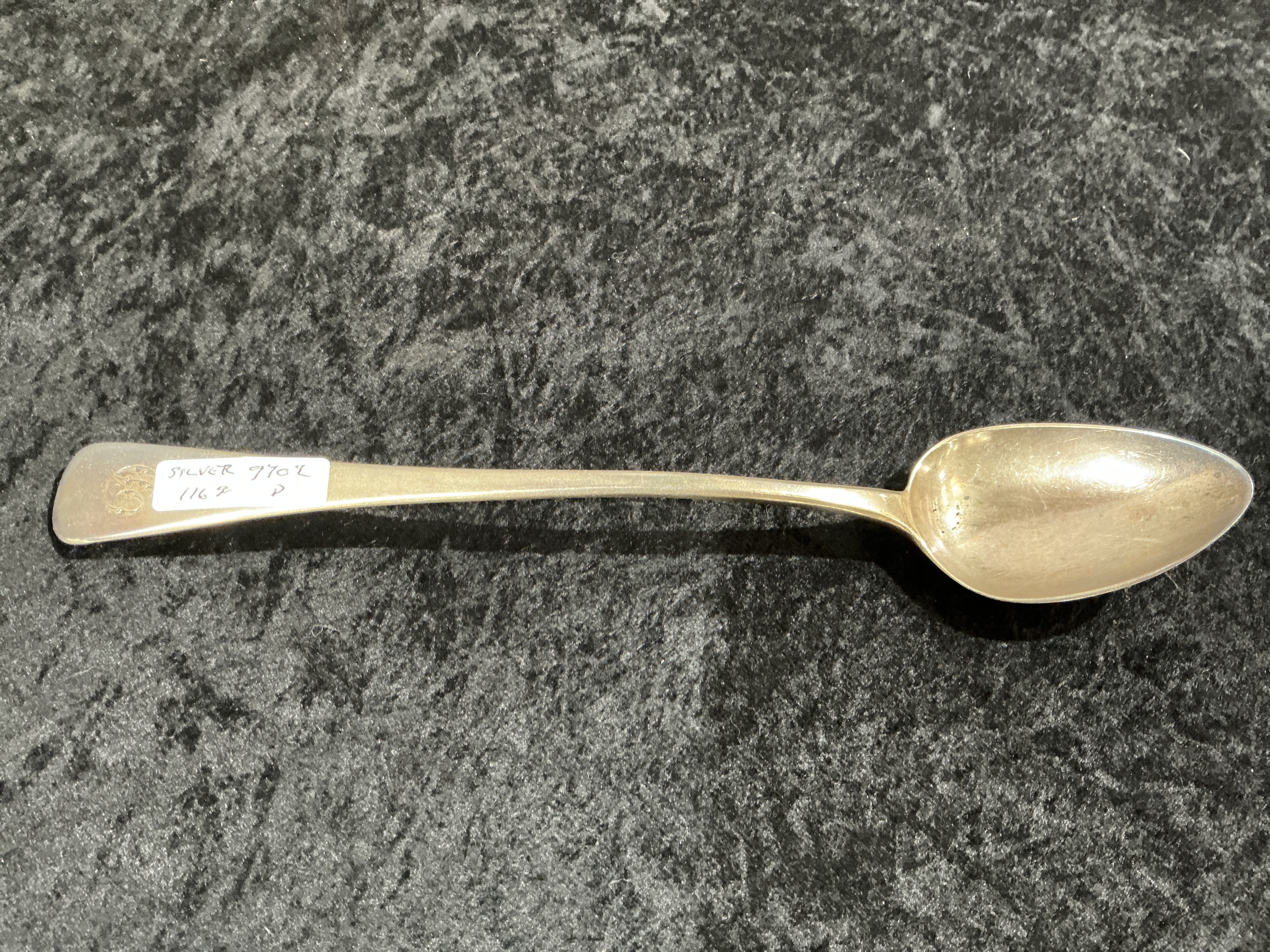 A George III sterling silver stuffing spoon in the Old English pattern. The spoon features a long, tapering handle with a rounded terminal. The front of the terminal is engraved with a crest depicting a dexter hand couped at the wrist grasping a serpent. The reverse of the handle is struck with a full set of London hallmarks. The maker’s mark is a literal transcription EB within a rectangular punch, attributed to the silversmith Elizabeth Bateman. The standard mark is the lion passant, indicating .925 sterling silver. The assay office mark is the crowned leopard’s head for London. The date letter is a capital M for 1807. The duty mark is the sovereign’s head of George III in profile facing right.
