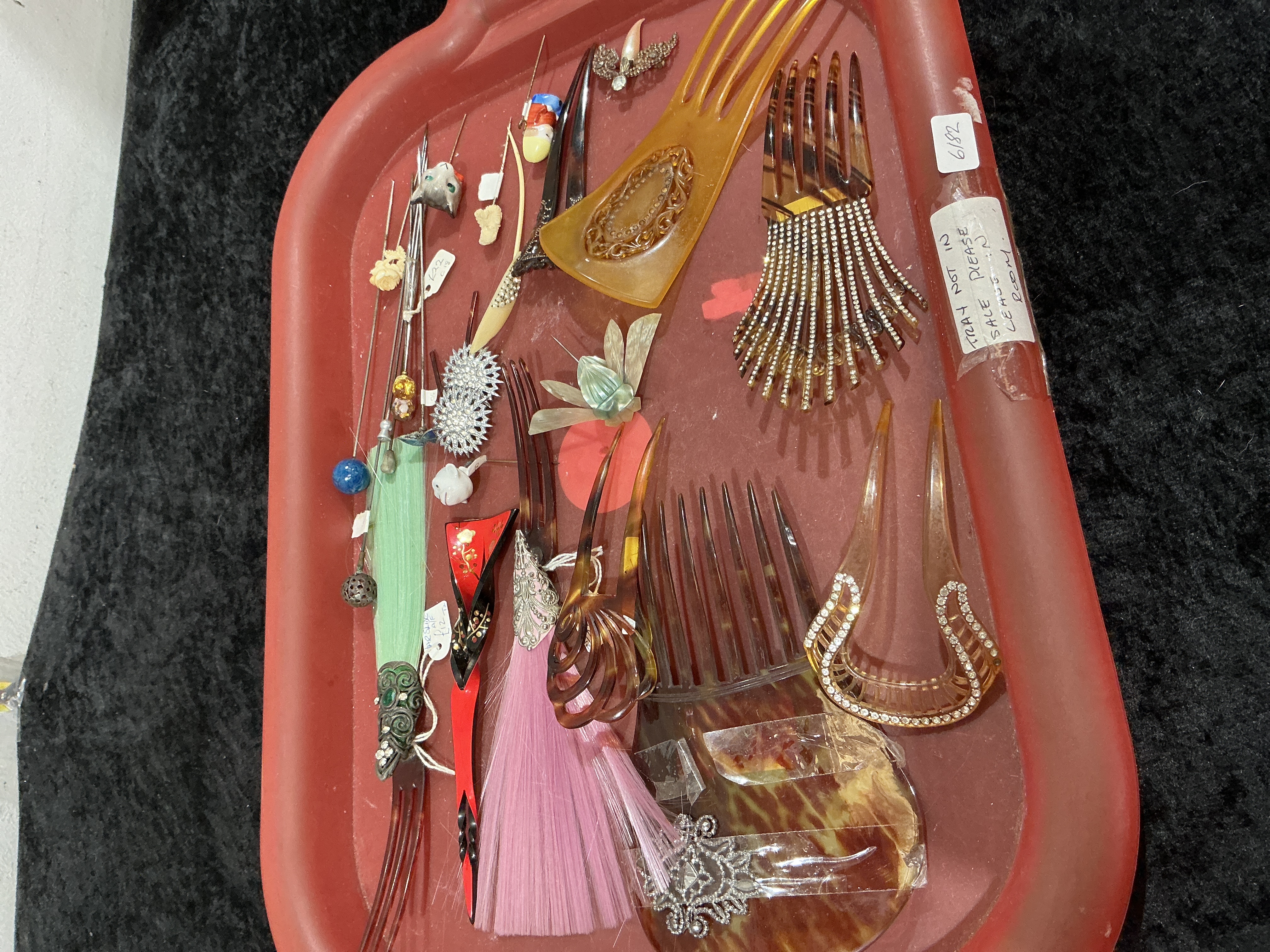 A diverse collection of hair ornaments and decorative pins dating from the late 19th to the mid-20th century. The lot includes several hair combs such as a large amber-coloured celluloid comb with a carved openwork scroll motif, a tortoiseshell-effect plastic comb set with rows of clear rhinestones, a large tortoiseshell-effect back comb, and a U-shaped tortoiseshell-effect hair pin with rhinestone-set borders. Decorative items include a red and black lacquered hair stick with hand-painted floral details, a green feather plume mounted on a silver-tone metal base set with green glass cabochons, and a pink textile tassel suspended from a silver-tone repoussé-style cap. The collection also contains various novelty pins and small collectibles, including a carved cat head hat pin, a bird-shaped brooch set with stones, an enamel figure, and several other decorative hat pins. Materials used include celluloid, tortoiseshell-effect plastics, base metals, glass rhinestones, glass cabochons, enamel, textile, and feathers. No maker’s marks or signatures are visible on the items.