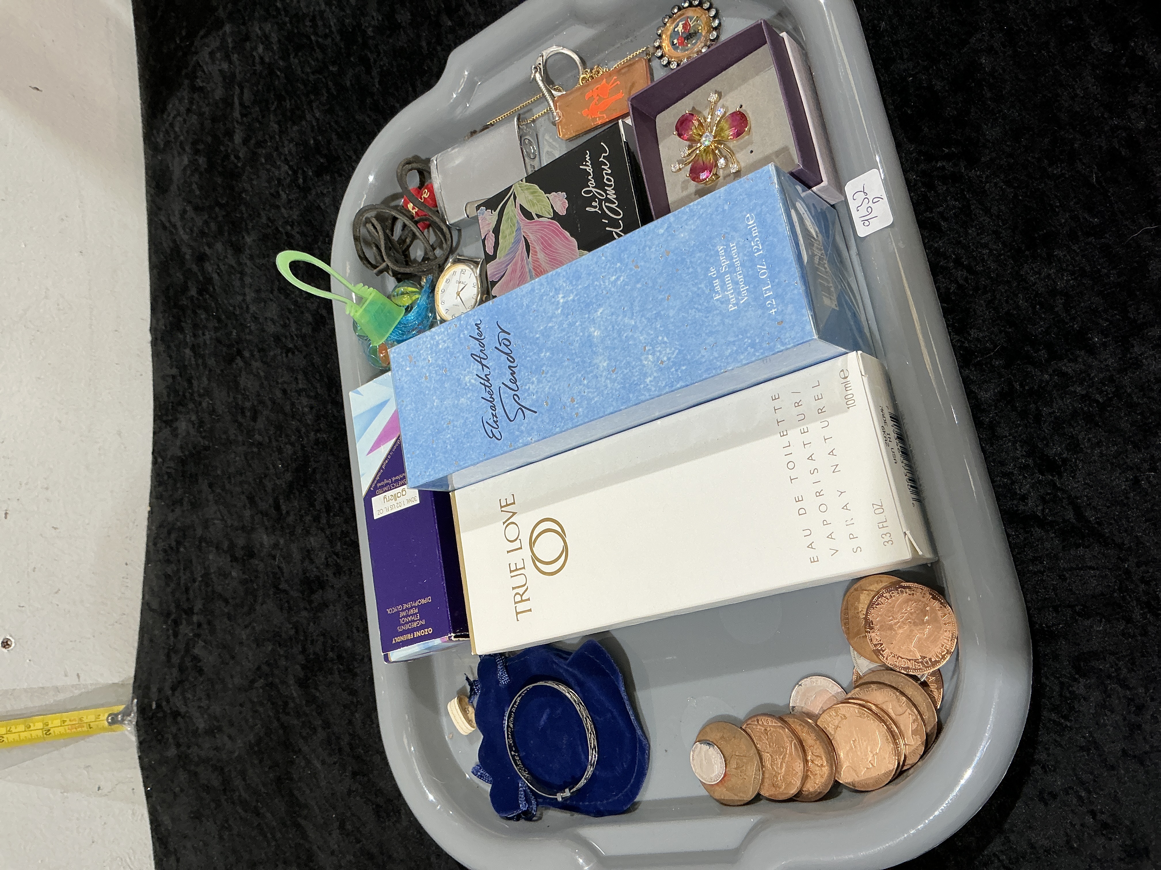 A collection of miscellaneous items including jewellery, a wristwatch, fragrances, and currency. The jewellery comprises a silver christening bangle, a boxed gold-tone floral brooch set with faceted pink and colourless stones, a circular gold-tone brooch featuring a central portrait miniature surrounded by clear paste stones, and a copper-toned rectangular pendant on a fine-link chain. The wristwatch features a white dial with Arabic numerals and is marked OMAC on the face, housed in a gold-tone case. The lot includes several boxed fragrances including Elizabeth Arden Splendor (125ml), Elizabeth Arden True Love (100ml), and Le Jardin d’Amour. Additional items include a silver-toned metal lighter or case and a quantity of British decimal copper-coloured coins depicting Queen Elizabeth II with the partial inscription D G REG F D.