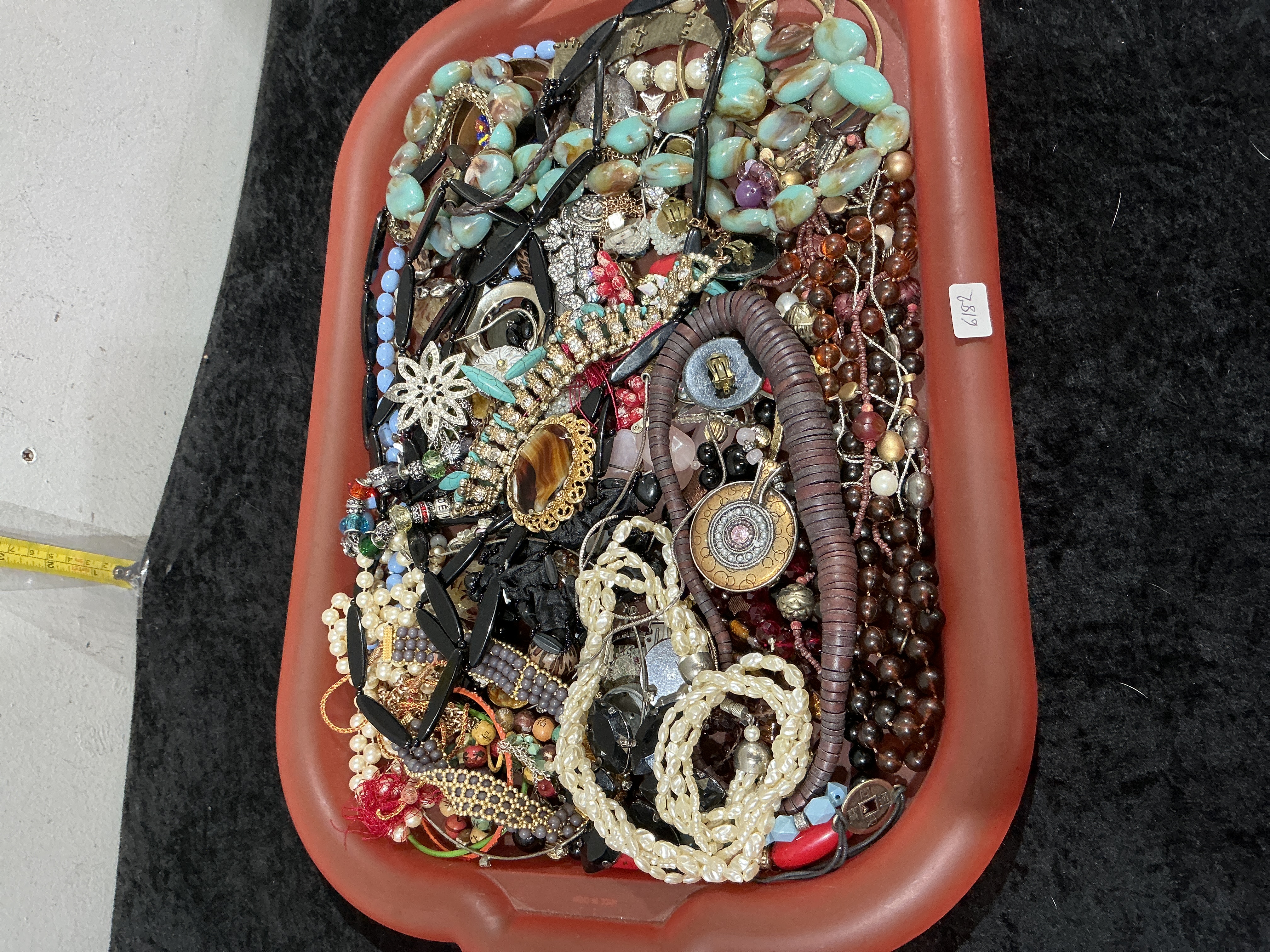 A large collection of assorted costume jewellery comprising various necklaces, brooches, pendants, and charms. The lot includes multi-strand graduated faux pearl necklaces in cream tones, faceted glass bead necklaces in black and red, and turquoise-effect beaded strands. Notable pieces include a silver-tone snowflake design brooch heavily set with clear rhinestones and a gold-tone oval brooch featuring a central brown-banded agate-style cabochon within a faux pearl border. Also present is a circular gold-tone pendant with concentric detailing and a central pink stone, alongside various boho-style beaded items, amber-effect resin pieces, and a replica Chinese coin charm. The items feature a mix of gold-tone and silver-tone base metal chains and findings. The collection is presented in a red plastic tray with a hand-written label marked 2819.
