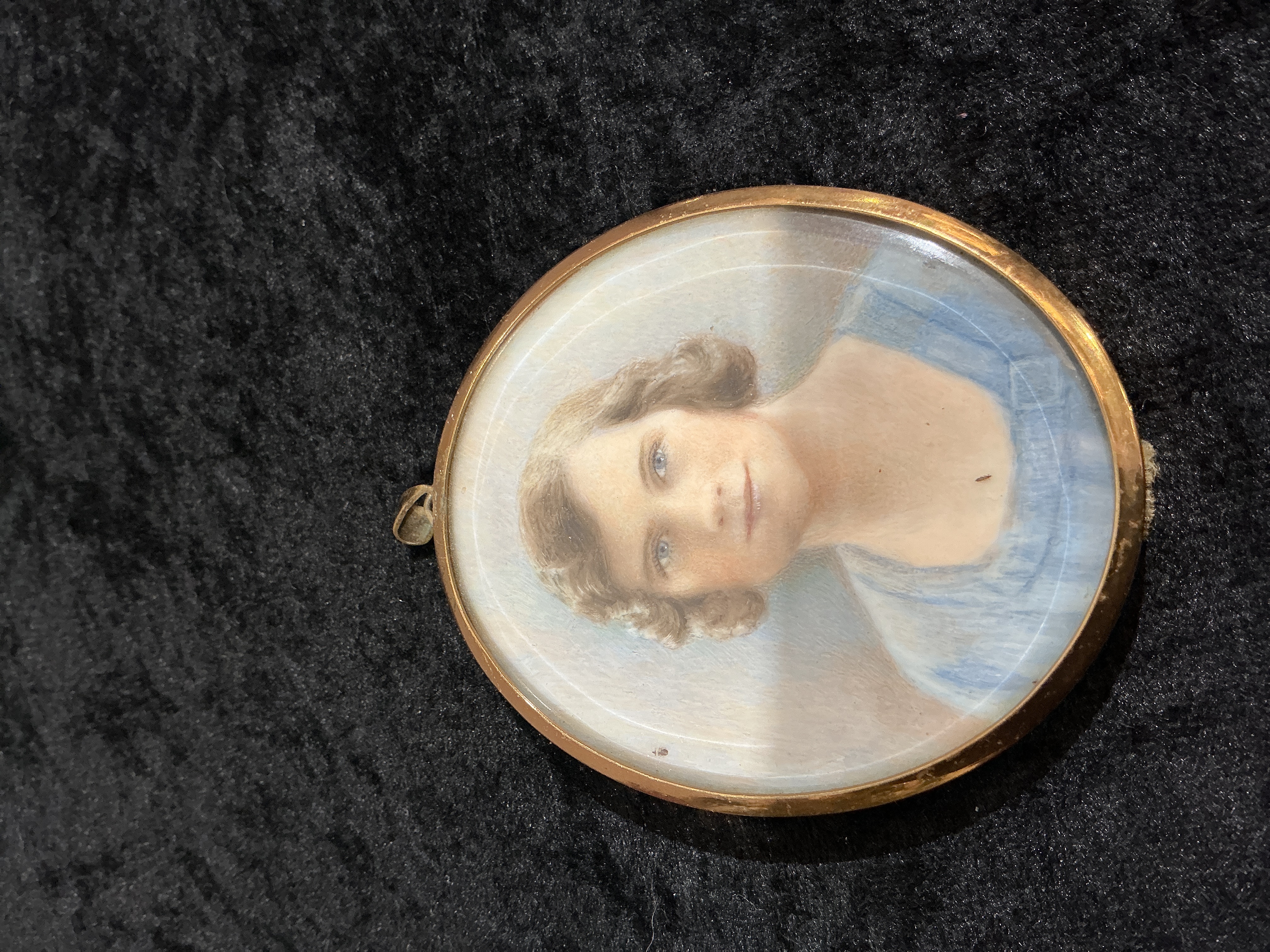 This early 20th-century portrait miniature is executed in watercolour with gouache highlights on a thin substrate, likely ivory or card. The subject is a young woman with blue eyes and wavy brown hair, depicted head-and-shoulders in a light blue dress against a pale, neutral background. The piece is rendered in a traditional representational style with fine, delicate brushwork characteristic of British portrait miniatures of the period. At the lower edge, there are small, dark characters that appear to be a signature, but they are too indistinct to read or transcribe accurately. The miniature is set within an oval plated ware mount featuring a small suspension loop and a protective convex glass cover. The item is identified as a plated ware miniature.