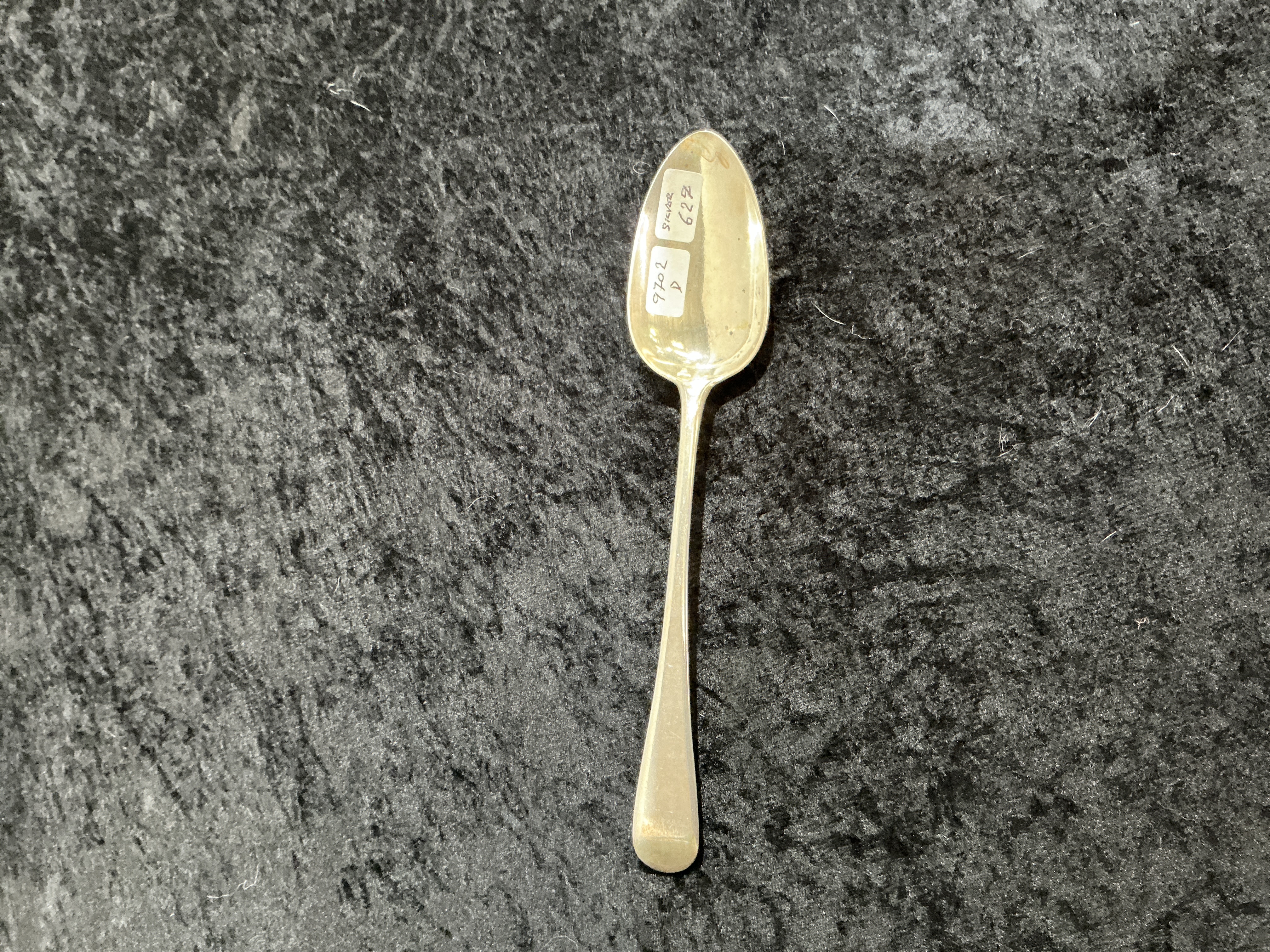 A George III sterling silver spoon produced in the Old English pattern. The reverse of the handle is struck with a full set of London hallmarks. The maker’s mark WE over WF in a rectangular punch identifies the silversmiths as William Eley and William Fearn. The sequence of marks includes the lion passant for sterling silver, the crowned leopard’s head for the London Assay Office, and the lowercase Roman letter c which corresponds to the year 1798. The sovereign’s duty mark featuring the profile of King George III is also present.