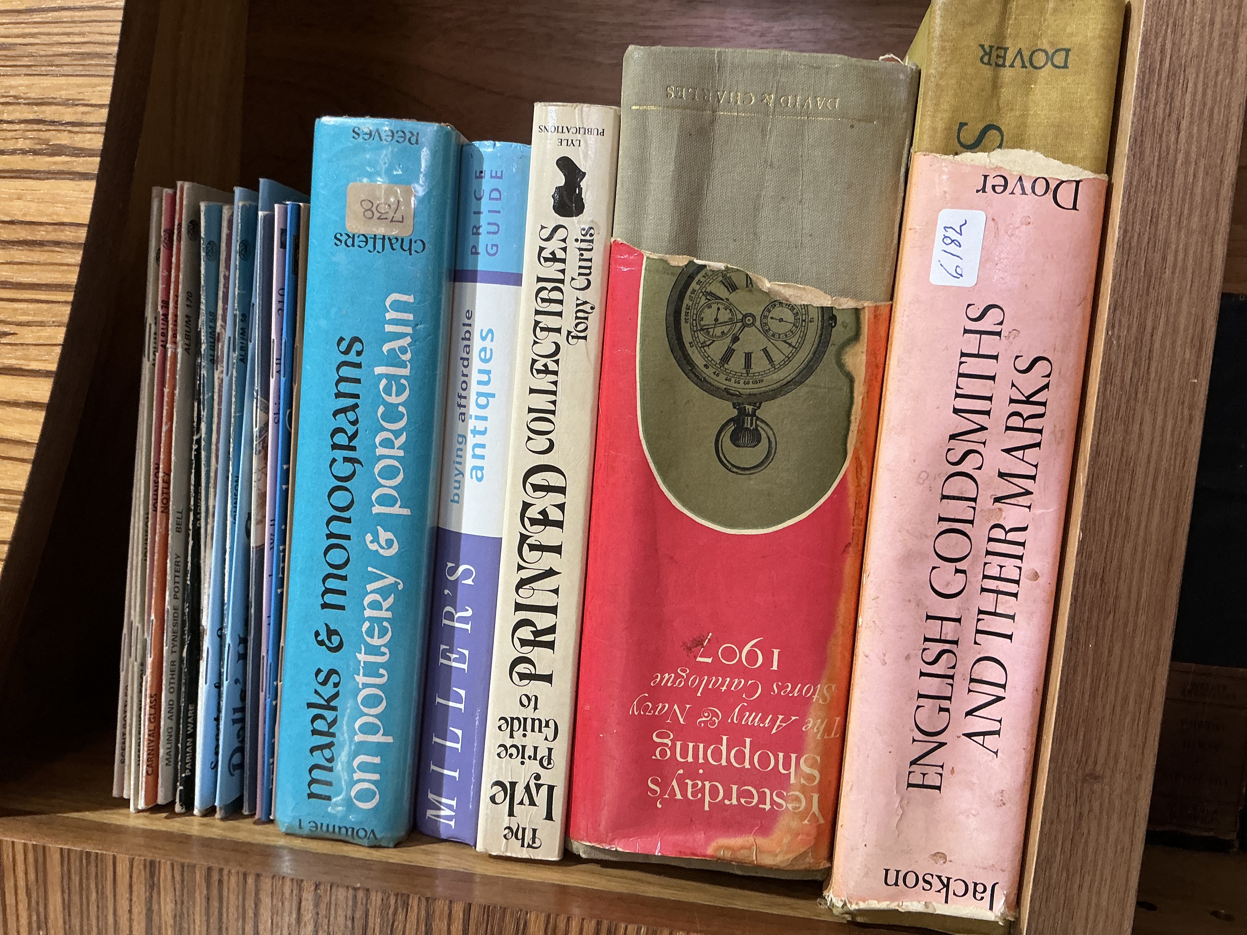 A collection of reference volumes and booklets regarding antiques and collectables, including various hardcover and softcover volumes in octavo and smaller formats. Key titles include English Goldsmiths and Their Marks by Jackson, published by Dover; Yesterday’s Shopping: The Army & Navy Stores Catalogue 1907, published by David & Charles; The Lyle Price Guide to Printed Collectibles by Tony Curtis, published by Lyle Publications; Miller’s Buying Affordable Antiques Price Guide; and Marks & Monograms on Pottery & Porcelain Volume 1 by Chaffers, published by Reeves. The collection also contains a group of thin softcover booklets and pamphlets with titles including Carnival Glass, Maling and Other Tyneside Pottery, and Parian Ware. Several volumes are presented with their original dust jackets. Two volumes bear small adhesive stickers with the handwritten numbers 6182 and 758.