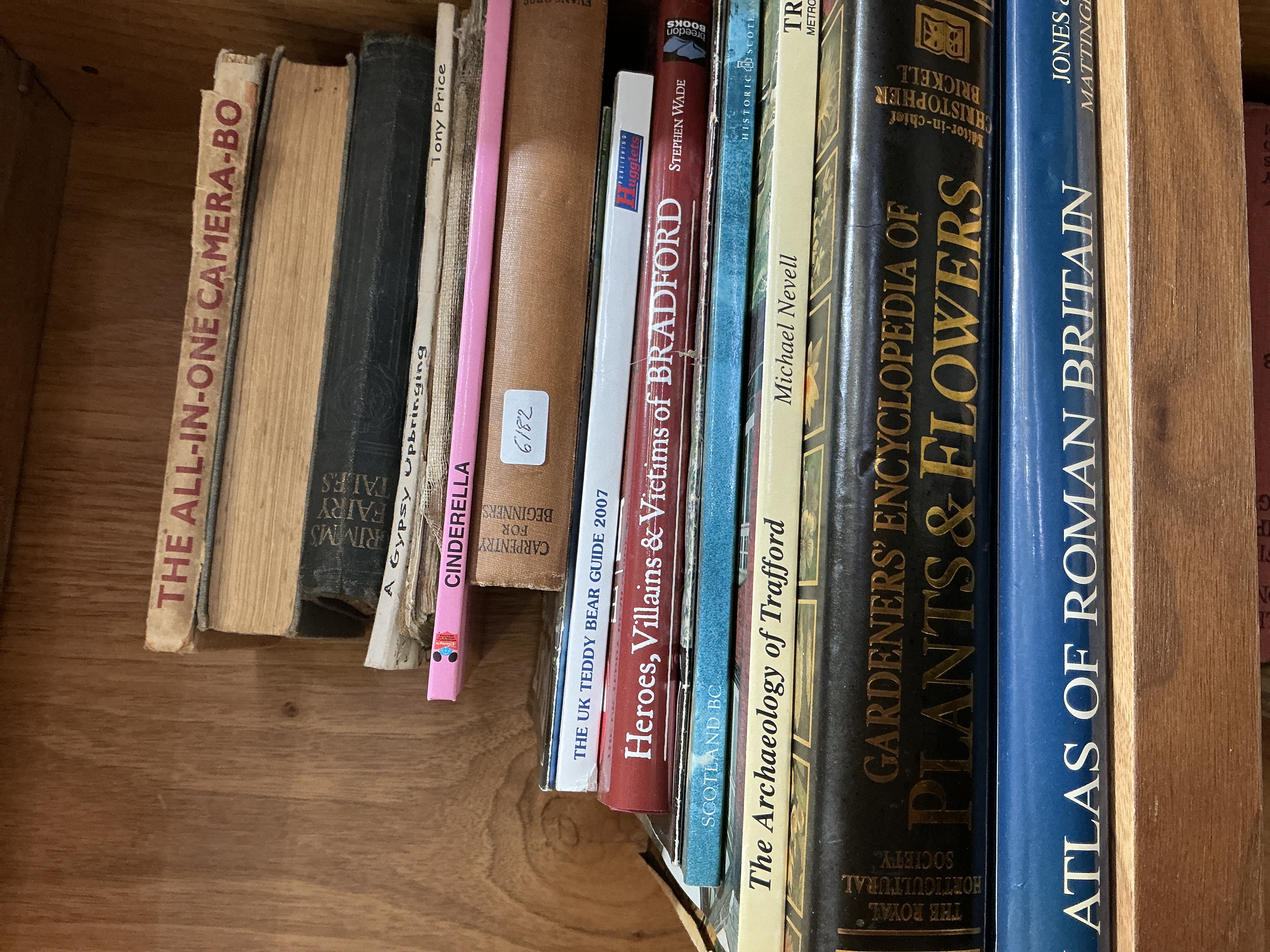 A collection of volumes covering diverse subjects including horticulture, archaeology, local history, and children’s literature. The group includes The Royal Horticultural Society Gardeners’ Encyclopedia of Plants and Flowers (Editor-in-chief Christopher Brickell), Jones and Mattingly’s Atlas of Roman Britain, and Michael Nevell’s The Archaeology of Trafford. Other titles present are Heroes, Villains and Victims of Bradford by Stephen Wade (Breedon Books), Scotland BC (Historic Scotland), A Gypsy Upbringing by Tony Price, Grimm’s Fairy Tales, Cinderella, Carpentry for Beginners, The All-In-One Camera-Book, and The UK Teddy Bear Guide 2007 (Hugglets Publishing). The lot comprises a mix of hardcovers, several with dust jackets, and softcover paperbacks, in sizes ranging from octavo to large quarto.