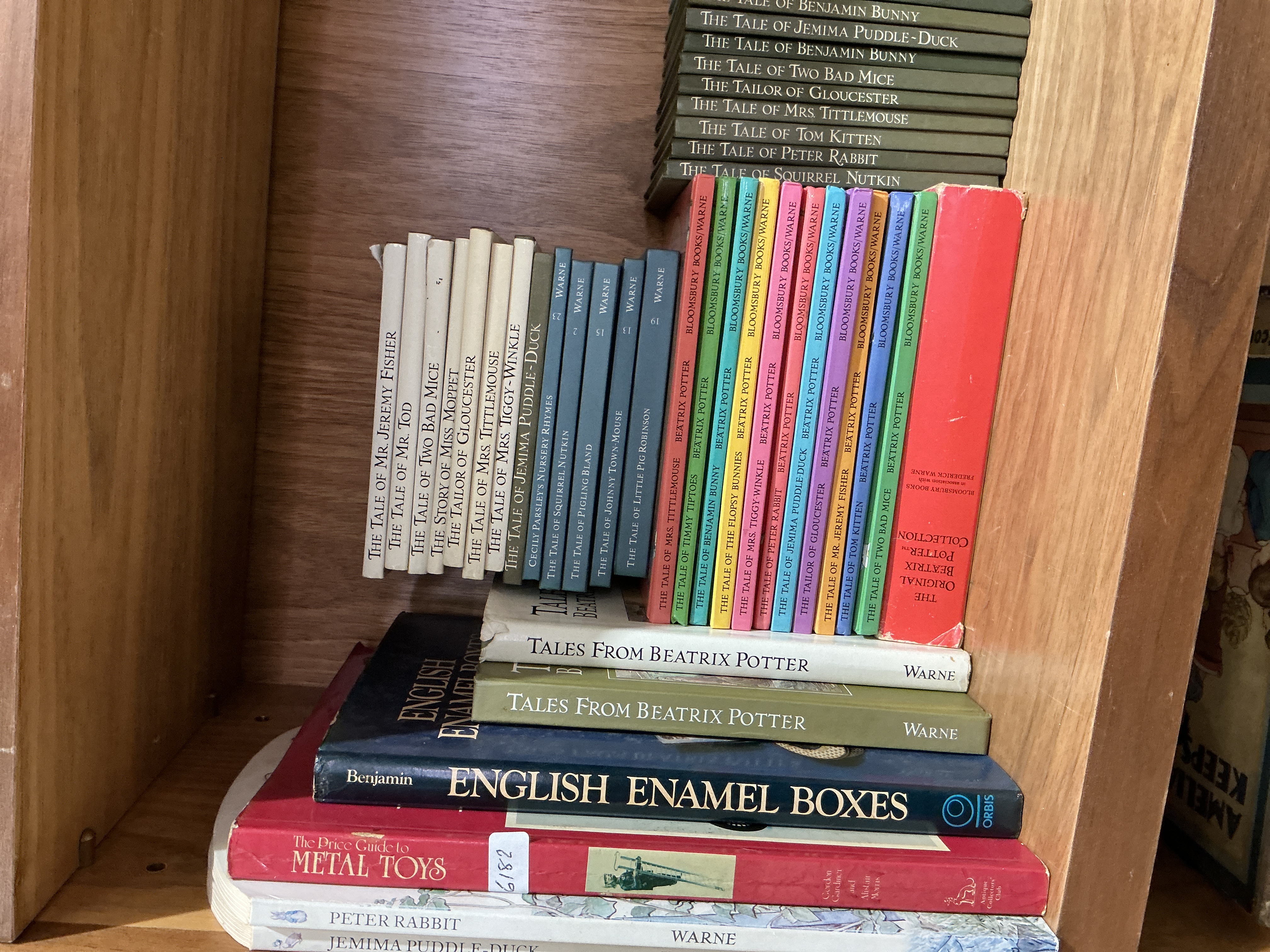 A collection of volumes primarily comprising the works of Beatrix Potter, alongside reference literature on antiques and collectibles. The grouping includes multiple series of Potter’s tales published by Frederick Warne & Co. and Bloomsbury Books. One series consists of small-format hardcovers with white and blue or green spines, featuring titles such as The Tale of Mr. Jeremy Fisher, The Tale of Mr. Tod, The Tale of Two Bad Mice, The Story of Miss Moppet, The Tailor of Gloucester, The Tale of Mrs. Tittlemouse, The Tale of Mrs. Tiggy-Winkle, The Tale of Jemima Puddle-Duck, Cecily Parsley’s Nursery Rhymes, The Tale of Squirrel Nutkin, and numbered volumes including The Tale of Pigling Bland (15), The Tale of Johnny Town-Mouse (13), and The Tale of Little Pig Robinson (19). The name WARNE is visible at the base of several spines in this series. A further series includes modern multi-coloured softcover editions published by Bloomsbury Books in association with Frederick Warne, featuring titles such as The Tale of Benjamin Bunny and The Tale of Peter Rabbit. The collection also features a larger red-bound volume titled The Original Beatrix Potter Collection and a stack of modern dark-green hardcovers. Non-Potter volumes include English Enamel Boxes by Susan Benjamin (Orbis) and The Price Guide to Metal Toys by Gordon Gardiner and Alistair Morris (Antique Collectors’ Club), the latter bearing a white adhesive label with the handwritten number 6182. The books are bound in a variety of publisher’s cloth, paper-covered boards, and softcovers, with many of the modern hardcovers retaining their dust jackets.