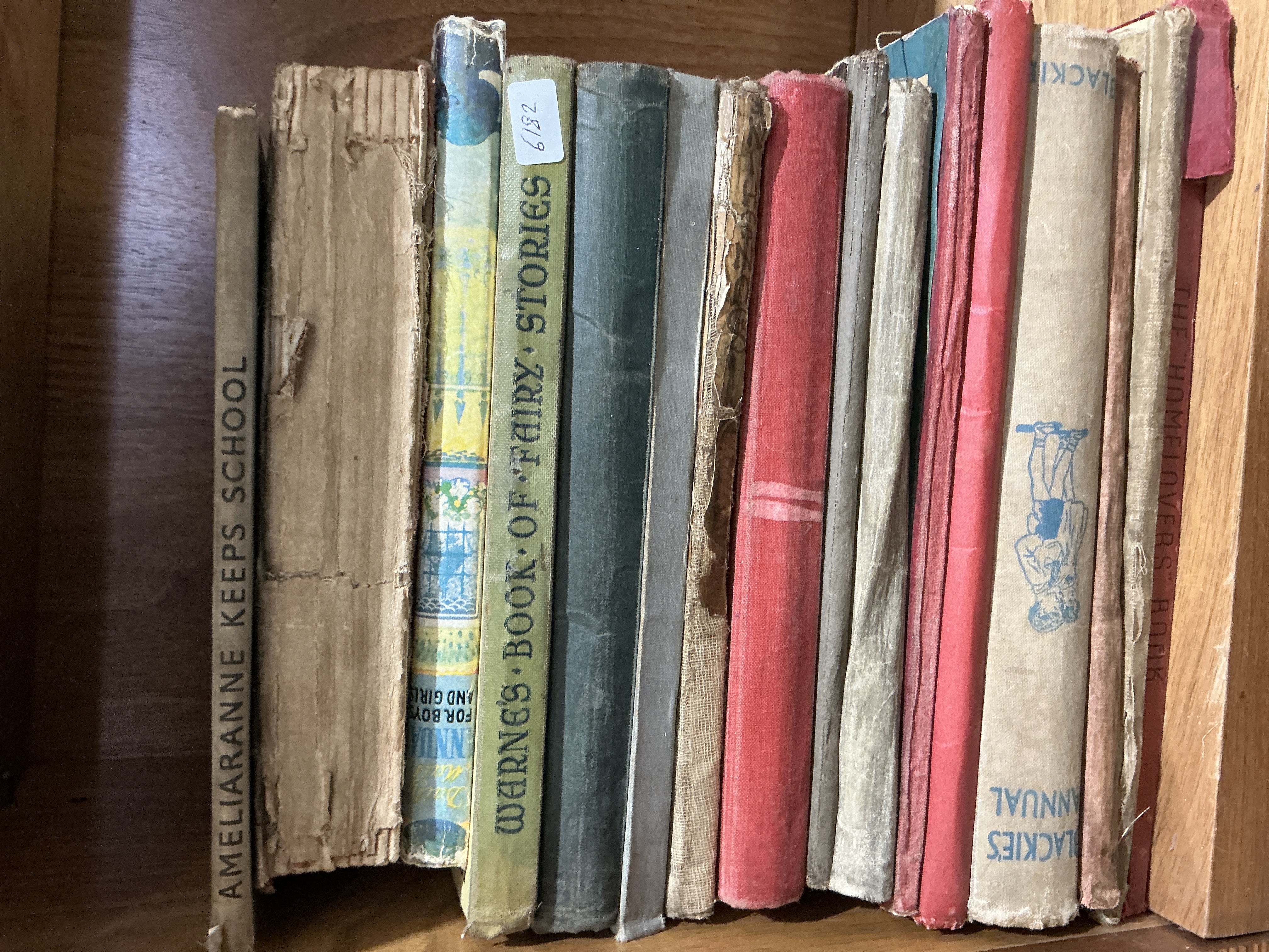 A collection of mid-20th-century British children’s books and annuals. Visible titles on the spines include Ameliaranne Keeps School, Warne’s Book of Fairy Stories, Blackie’s Annual, and The Homelover’s Book. The volumes are constructed with a mix of publisher’s cloth-bound spines and illustrated paper-covered boards. One volume, identified as Blackie’s Annual, features the spine text bound in an inverted orientation and includes a blue-stamped illustration of a boy with a tennis racket. The books are produced in octavo and small quarto formats. A white adhesive tag with the handwritten number 6182 is present on the spine of the volume published by Warne. No title pages or copyright dates are visible for further attribution.