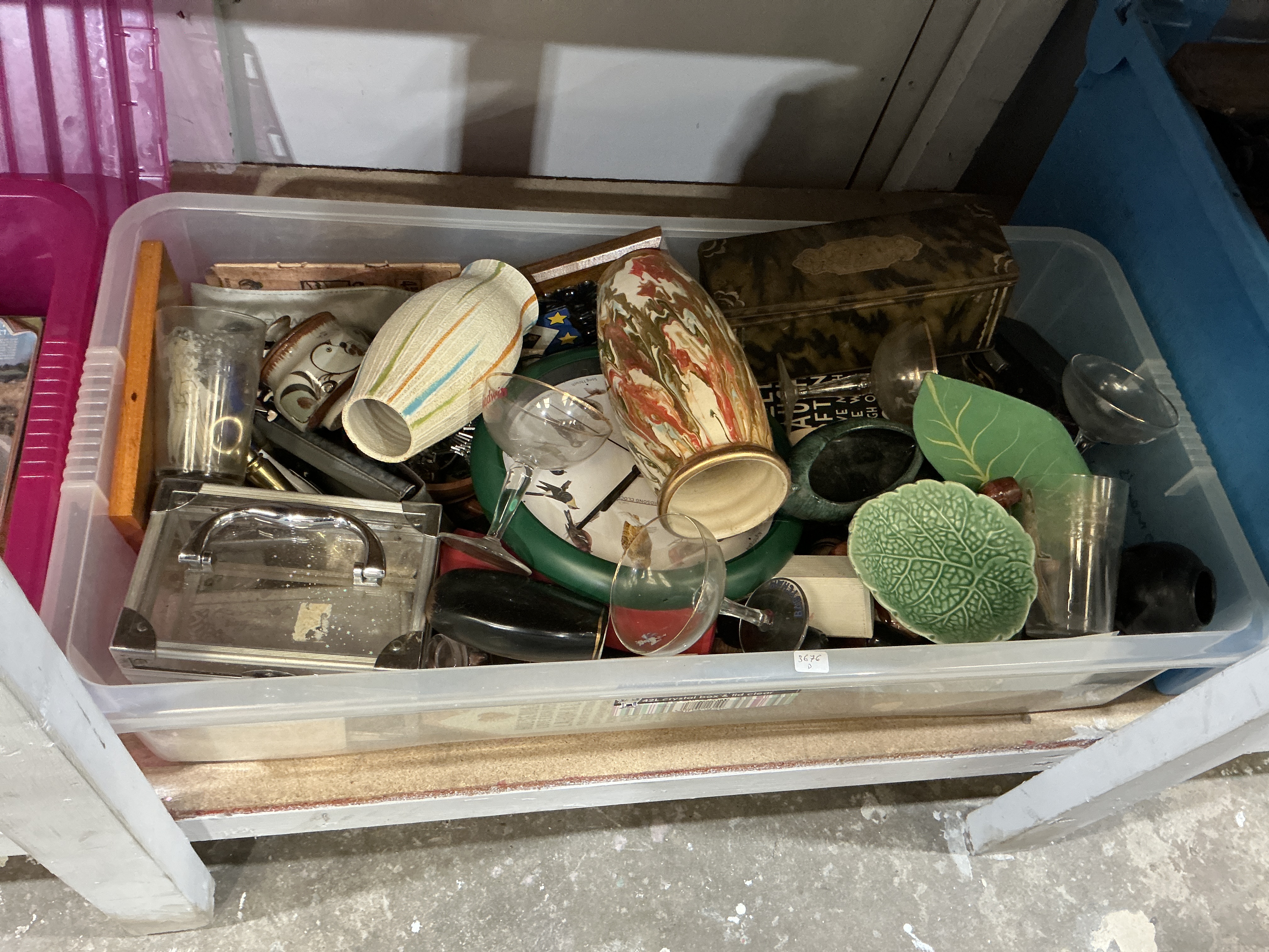 An assortment of household goods and decorative objects contained within a clear plastic storage bin. The collection includes various ceramics, notably a marbled-pattern pottery vase of ovoid form, a cream-coloured vase with vertical polychrome stripes, and leaf-moulded dishes in the style of mid-20th century manufacturers such as Carlton Ware. Glassware comprises several coupe cocktail glasses and tumblers. Also included is a circular wall clock featuring a green surround and a dial decorated with bird motifs, a small metal-bound carry case with a hinged handle, and a rectangular box with a textured, mottled finish. The lot is accompanied by various other small domestic sundries. A white label marked 3576 / D is affixed to the exterior of the container.