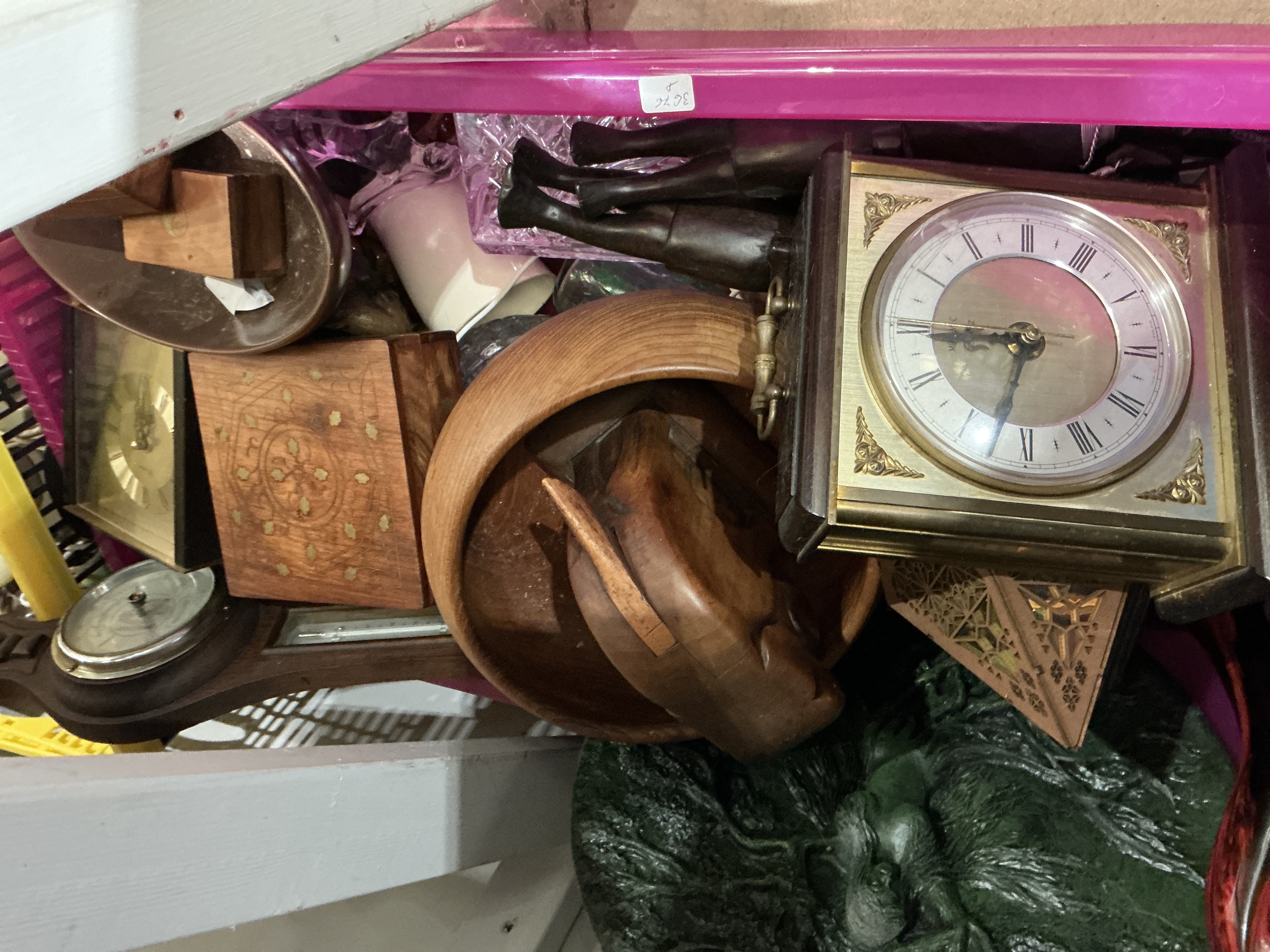 A collection of various decorative and household items. The lot includes a brass-toned mantel clock featuring a Roman numeral dial with the visible mark METAMEC, alongside a second smaller clock with a gilt dial. Also present is a wall-mounted barometer in a dark-stained wood case and a square wooden box with circular brass inlay. The group further contains several dark-stained carved wooden figurines, a large green textured sculptural piece, and other miscellaneous items.