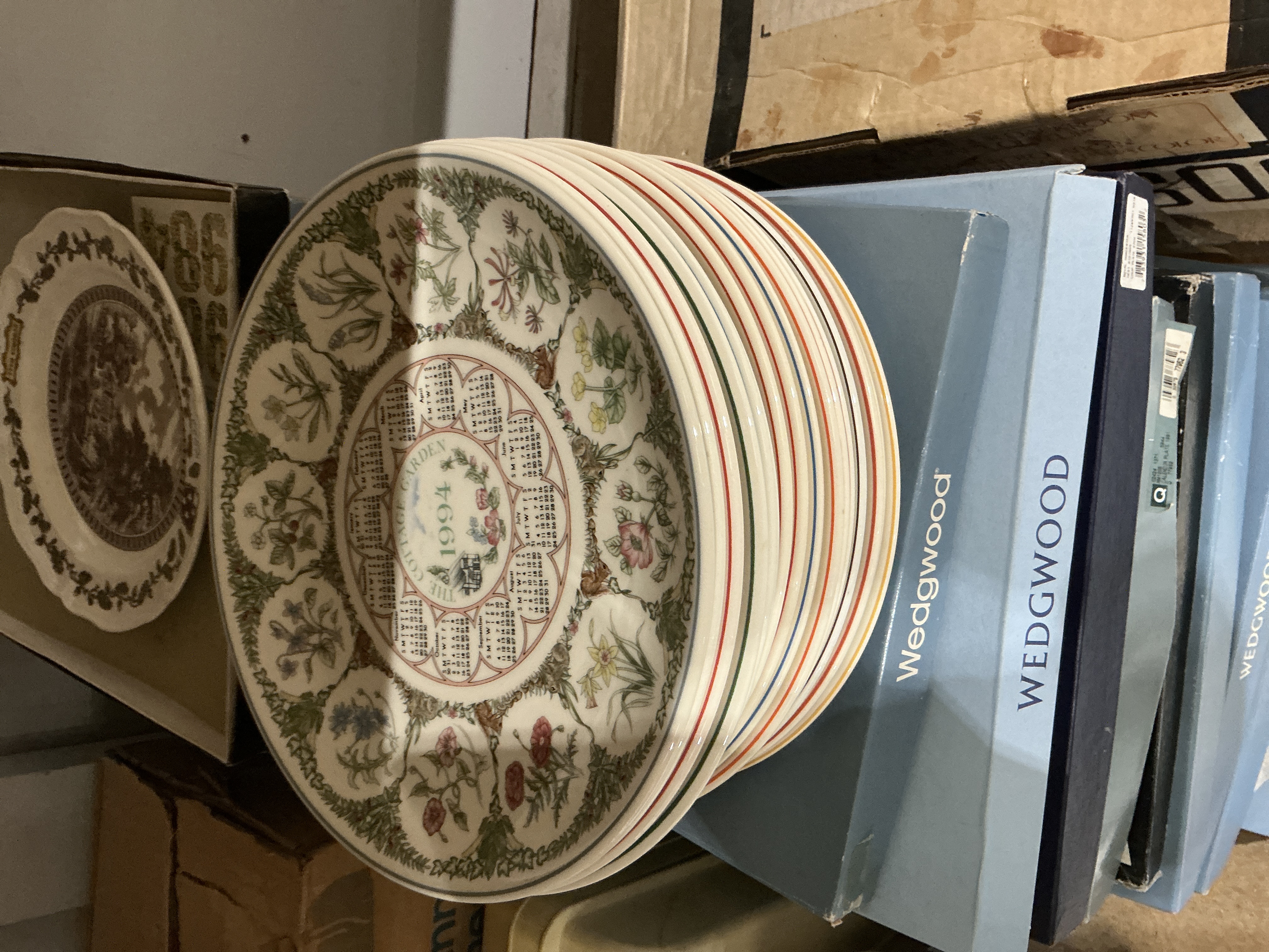 A collection of approximately 30 Wedgwood fine bone china decorative plates, primarily from the Cottage Garden annual calendar series. The 1994 plate features a central calendar for the year encircled by twelve botanical vignettes depicting various garden flowers, finished with a green foliate border at the rim. The decoration is applied using a multi-colour transfer-printing technique. The lot also includes a plate with a brown and white transfer-printed landscape scene. Many of the plates are contained within their original light blue Wedgwood manufacturer boxes.