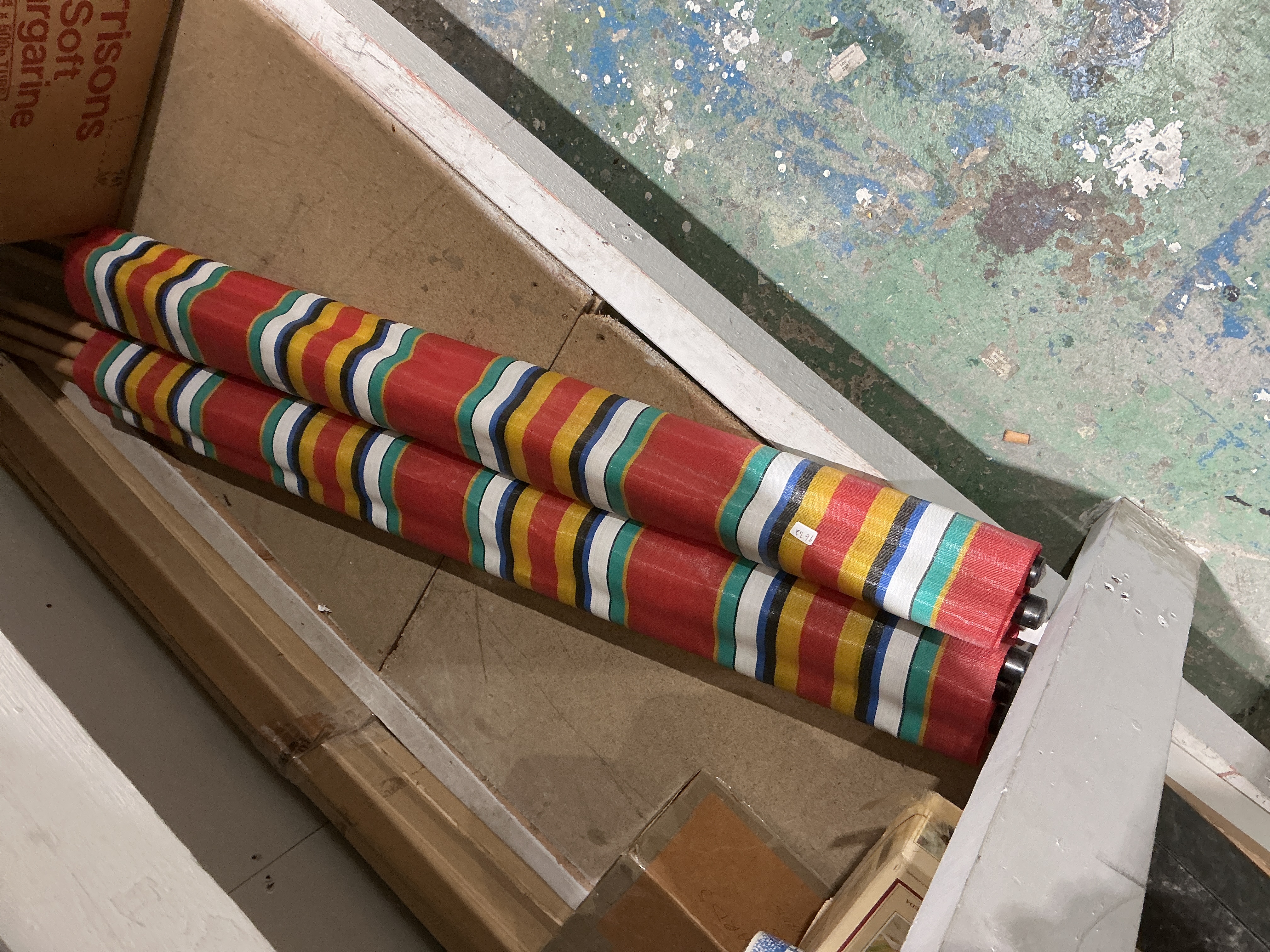 A pair of contemporary beach windbreakers featuring a traditional British seaside multi-coloured striped pattern. The fabric is a synthetic or treated canvas, comprising horizontal bands of red, yellow, green, blue, and white. Each windbreak is constructed with the fabric attached to a series of wooden poles, designed to be driven into the sand. The items are presented in a rolled state. While the pattern is characteristic of designs by retailers such as The Stripes Company, no manufacturer labels are present. A small white adhesive stock or price label is attached to one unit.