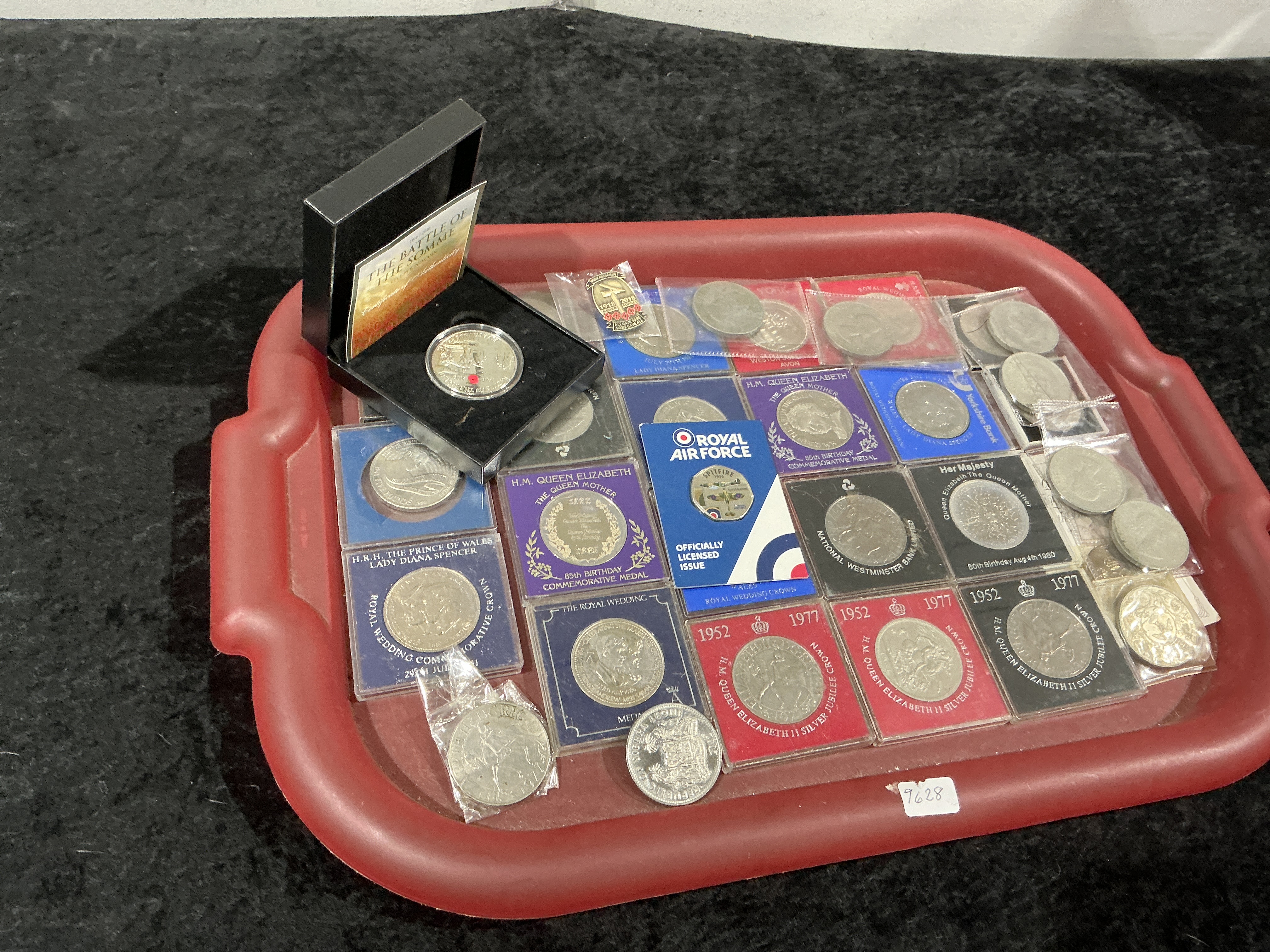 A collection of United Kingdom commemorative crowns and related numismatic memorabilia. The lot includes multiple 25 pence crowns issued for the 1977 Silver Jubilee of Queen Elizabeth II, the 1981 Royal Wedding of H.R.H. The Prince of Wales and Lady Diana Spencer, and the 80th and 85th birthdays of H.M. Queen Elizabeth The Queen Mother in 1980 and 1985. Many items are held in original bank-issued or retail packaging, including card mounts from National Westminster Bank and Yorkshire Bank. The collection also features a cased commemorative medal titled The Battle of the Somme in a black presentation box, an officially licensed Royal Air Force Spitfire pin badge, and a 1918-2018 centenary pin. One loose white metal coin is present featuring the inscription REPUBLIQUE on the obverse. The primary composition of the crowns is cupro-nickel.