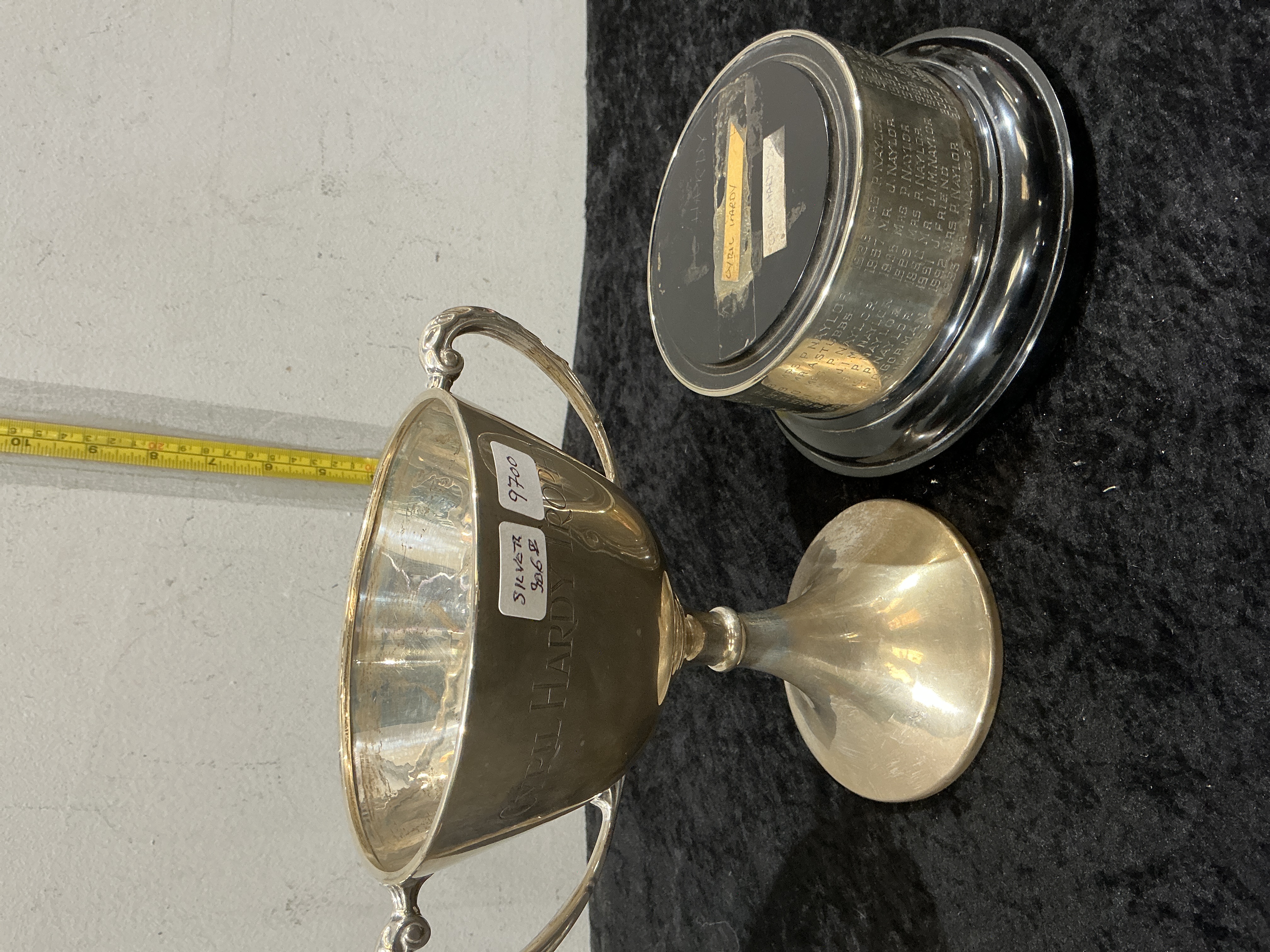 A hallmarked sterling silver trophy cup of footed, twin-handled form. The body of the cup is engraved with the inscription CYRIL HARDY TROPHY. The silver is hallmarked on the upper body with the lion passant, the leopard’s head for the London assay office, and the date letter s for 1933. The cup is presented with a separate black circular plinth base featuring a silver-coloured metal band. This band is engraved with a chronological list of winners beginning in 1980, including multiple entries for the Naylor family.