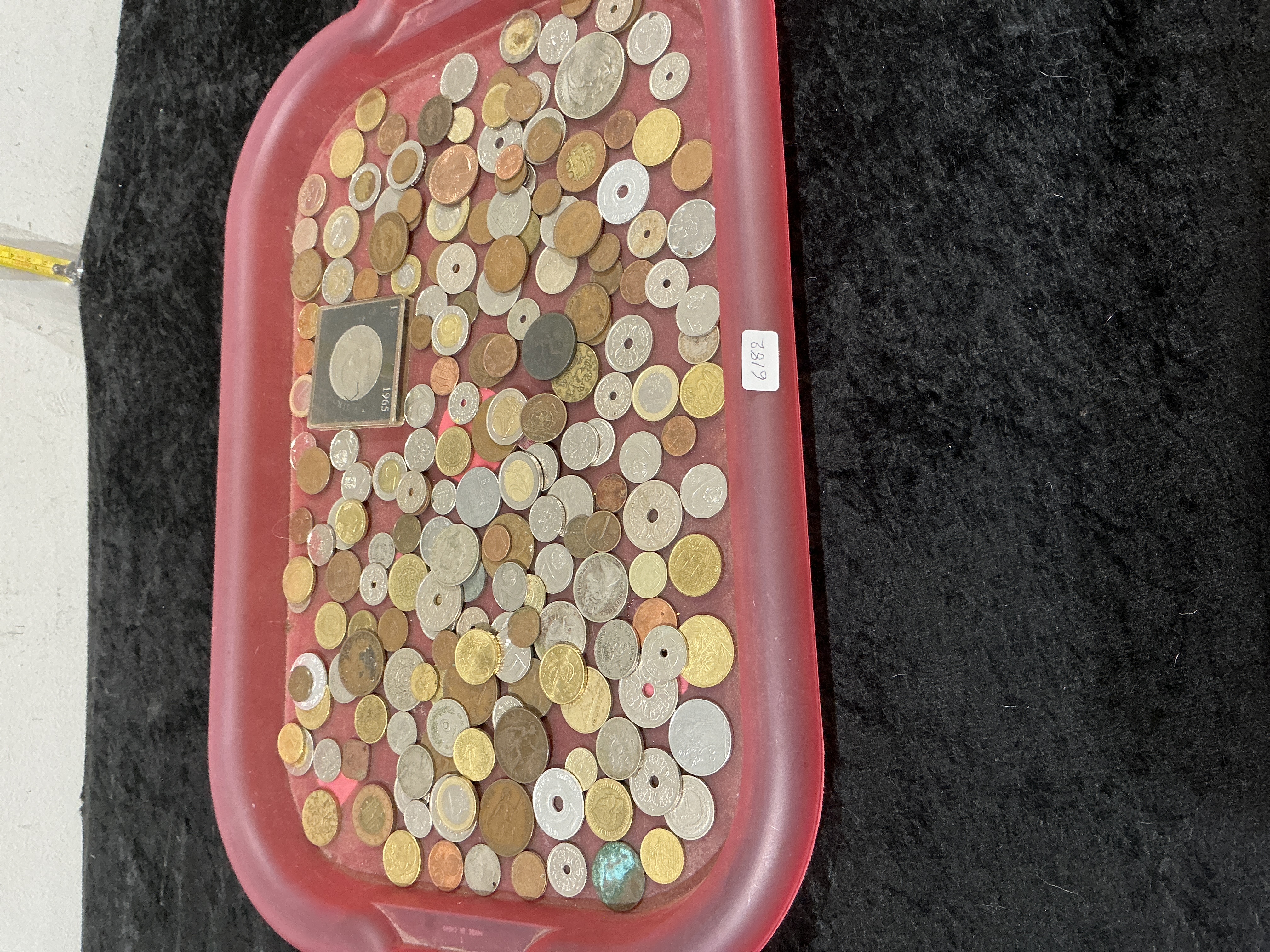 A collection of miscellaneous international and domestic coins from various periods. The lot includes a UK 1965 Churchill Crown (KM# 910) struck in cupro-nickel, housed in a square plastic holder. The assortment features various denominations and issuers, with coins struck in cupro-nickel, brass, bronze, and bimetallic compositions. Notable features include several coins with central perforations, modern decimal issues, and older pre-decimal pieces. Visible denominations include 10 and 20 on brass-coloured issues. Designs include portraits, heraldic symbols, and numeric denominations. The 1965 Churchill Crown was issued to commemorate the death of Sir Winston Churchill. The lot is presented in a red plastic tray bearing lot sticker 6182.