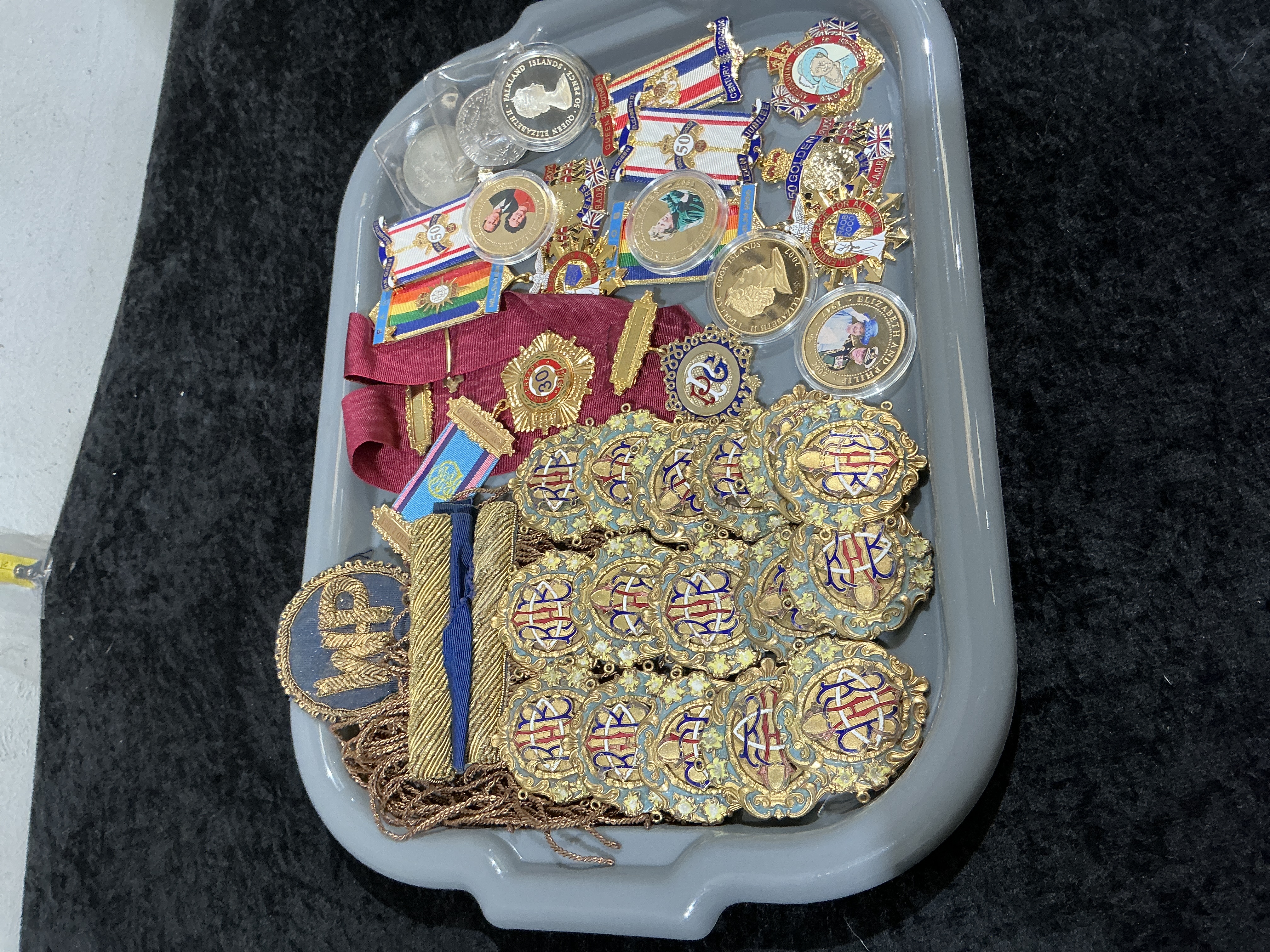 An assortment of fraternal regalia and commemorative items, primarily associated with the Royal Antediluvian Order of Buffaloes (RAOB) and British Royal milestones. The collection includes approximately ten RAOB jewels of gilt-metal and enamel construction, featuring a central interlocking RAOB cipher on a light blue ground, many with decorative scrollwork frames and associated suspension chains. Also included is a sunburst design medal marked 80 on a maroon ribbon, a badge with a rainbow-pattern ribbon, and a circular blue felt blazer badge featuring the letters MP embroidered in gold-tone bullion-style wire. The numismatic and commemorative section includes a white metal Falkland Islands 50 pence coin and a 2007 gilt-metal Cook Islands coin, both housed in plastic capsules. Further Royal commemoratives include an Elizabeth and Philip medallion, a 2002 Golden Jubilee badge on a red, white, and blue ribbon, and a Queen Mother Century of Service pin, alongside various other Jubilee-themed medals and commemorative pins.