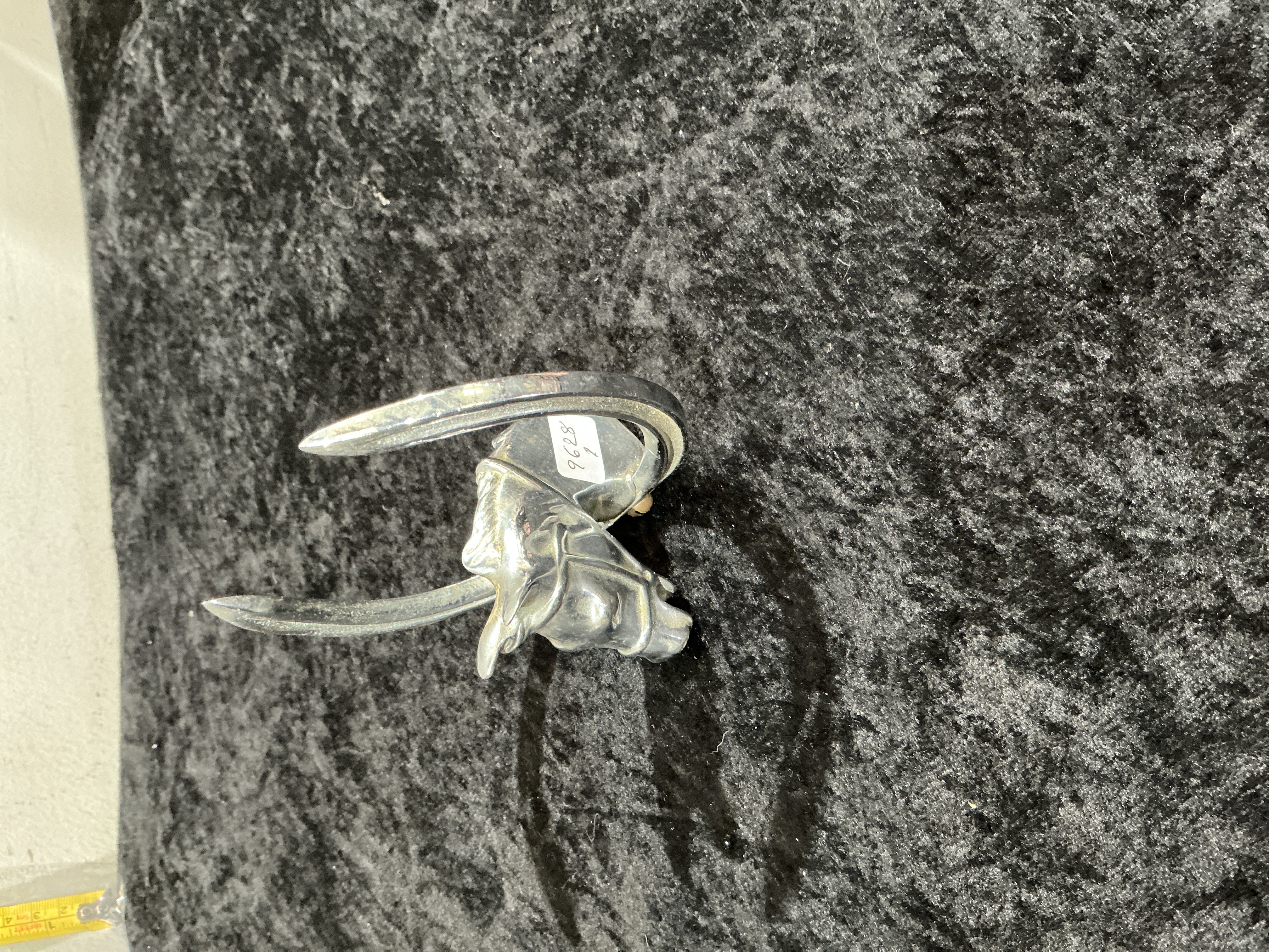 A mid-20th-century automotive mascot manufactured by Desmo of Birmingham, United Kingdom. The design features a donkey’s head set within a horseshoe frame. The mascot is constructed from chrome-plated die-cast metal and includes a mounting base with a central threaded hole for attachment to a radiator cap. The flat base is incised with the maker’s mark DESMO and the words MADE IN ENGLAND. A small brass securing screw remains in place at the rear of the horseshoe.