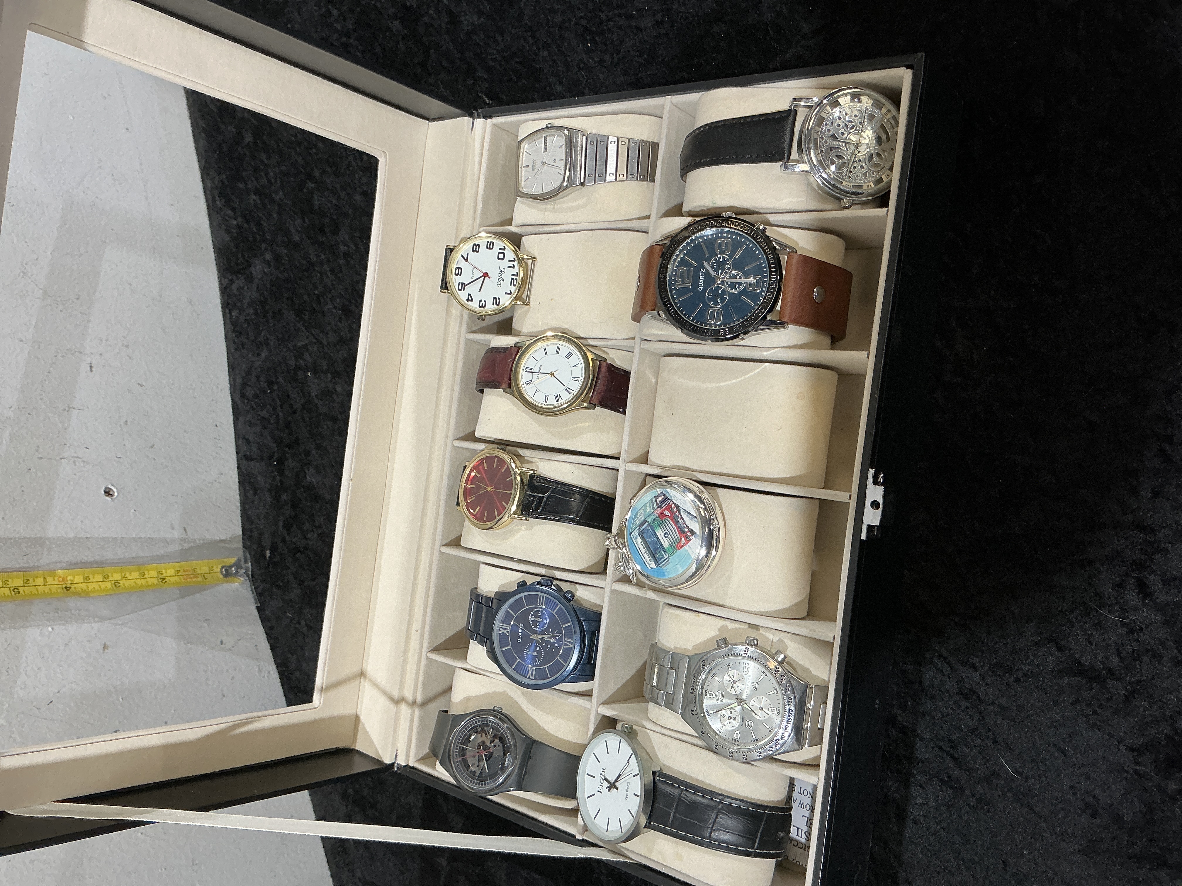 A Collection of Assorted Wristwatches and a Pocket Watch in a Twelve-Slot Display Case