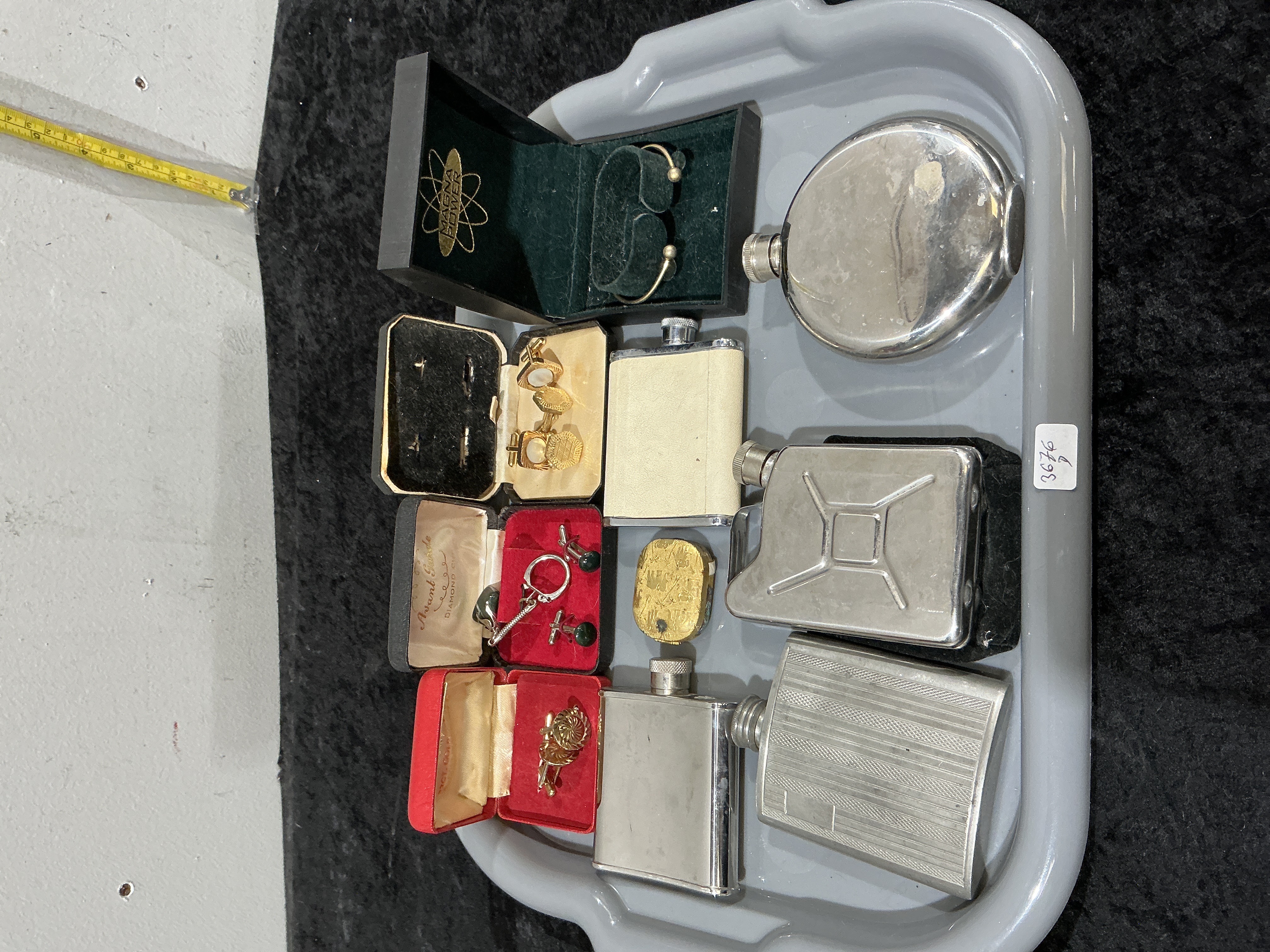 An assortment of personal accessories and jewellery presented on a grey tray. The collection includes a yellow gold-tone torque bangle with ball terminals, housed in a box marked Magna Power. Also included are several pairs of yellow gold-tone and silver-tone cufflinks, including one pair featuring green cabochon inserts. Further jewellery items consist of a silver-tone ring and chain in a box marked Avant Garde Diamond Cut, a yellow gold-tone brooch in a stylized floral or lion’s head design, and a small oval yellow gold-tone pill box or locket featuring an engraved scrollwork pattern on the lid. The lot also contains a group of silver-tone metal hip flasks of various designs, comprising a large circular polished flask, an engine-turned rectangular flask with vertical linear patterns, a plain rectangular flask, a small flask with a cream-coloured textured covering, and a flask modelled in the form of a miniature jerry can. While some items are housed in branded boxes, no specific metal purity hallmarks or maker’s marks are visible on the items themselves.