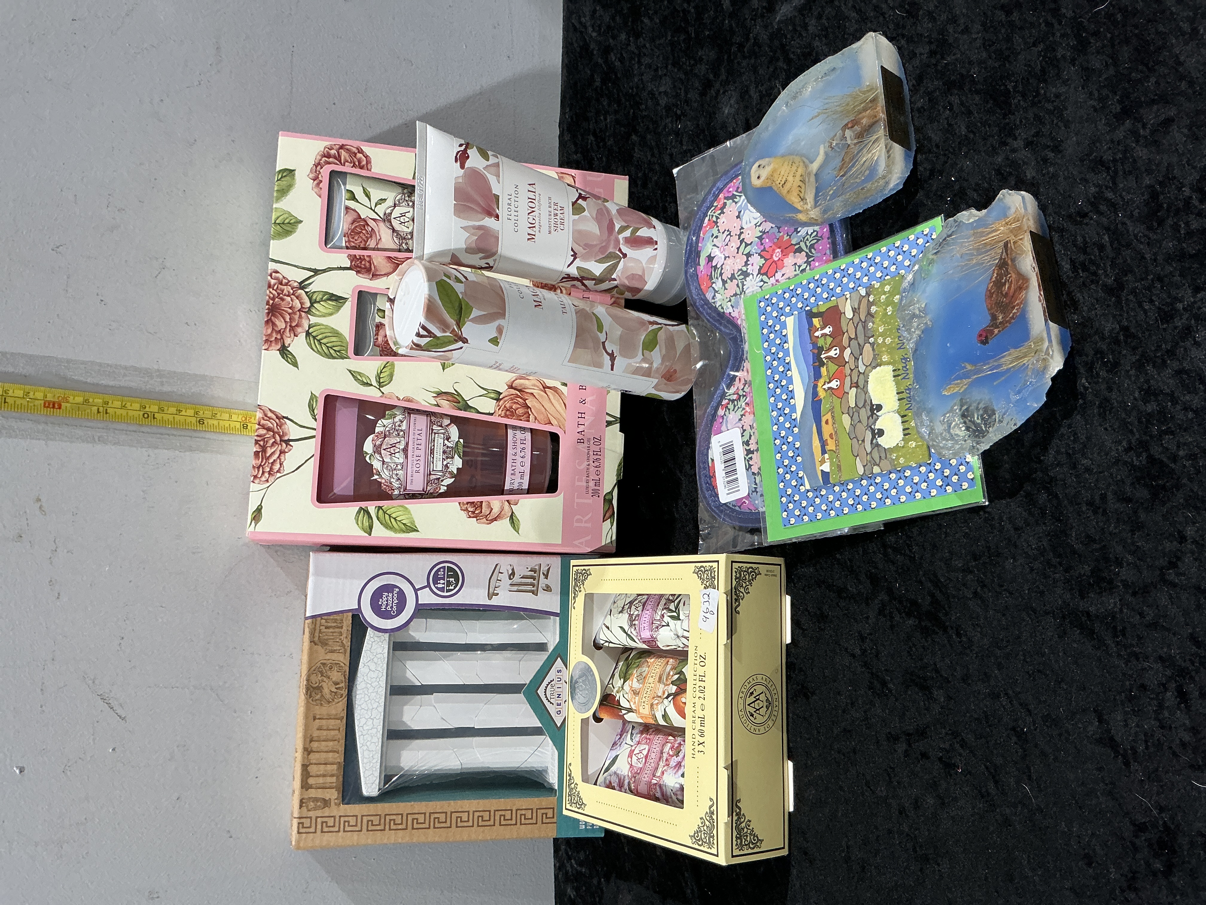 This collection of wholesale giftware and personal care items features products from Aromas Artesanales de Antigua and The Happy Puzzle Company. The personal care selection includes an Aromas Artesanales de Antigua Floral Collection bath and body set containing two 200ml tubes of Magnolia moisture rich shower cream and Rose Petal luxury bath and shower gel. Also included is a boxed Aromas Artesanales de Antigua hand cream collection containing three 60ml tubes. The lot contains a True Genius wooden puzzle by The Happy Puzzle Company, presented in its original Greek-themed packaging. Additional items comprise a floral-patterned fabric eye mask in a plastic sleeve, two decorative resin or glass ornaments depicting an owl and a game bird, and an illustrated notepad featuring a farmyard scene. The bath and body products are marked with the AA logo and brand name. The hand cream box features a circular logo for Aromas Artesanales de Antigua.