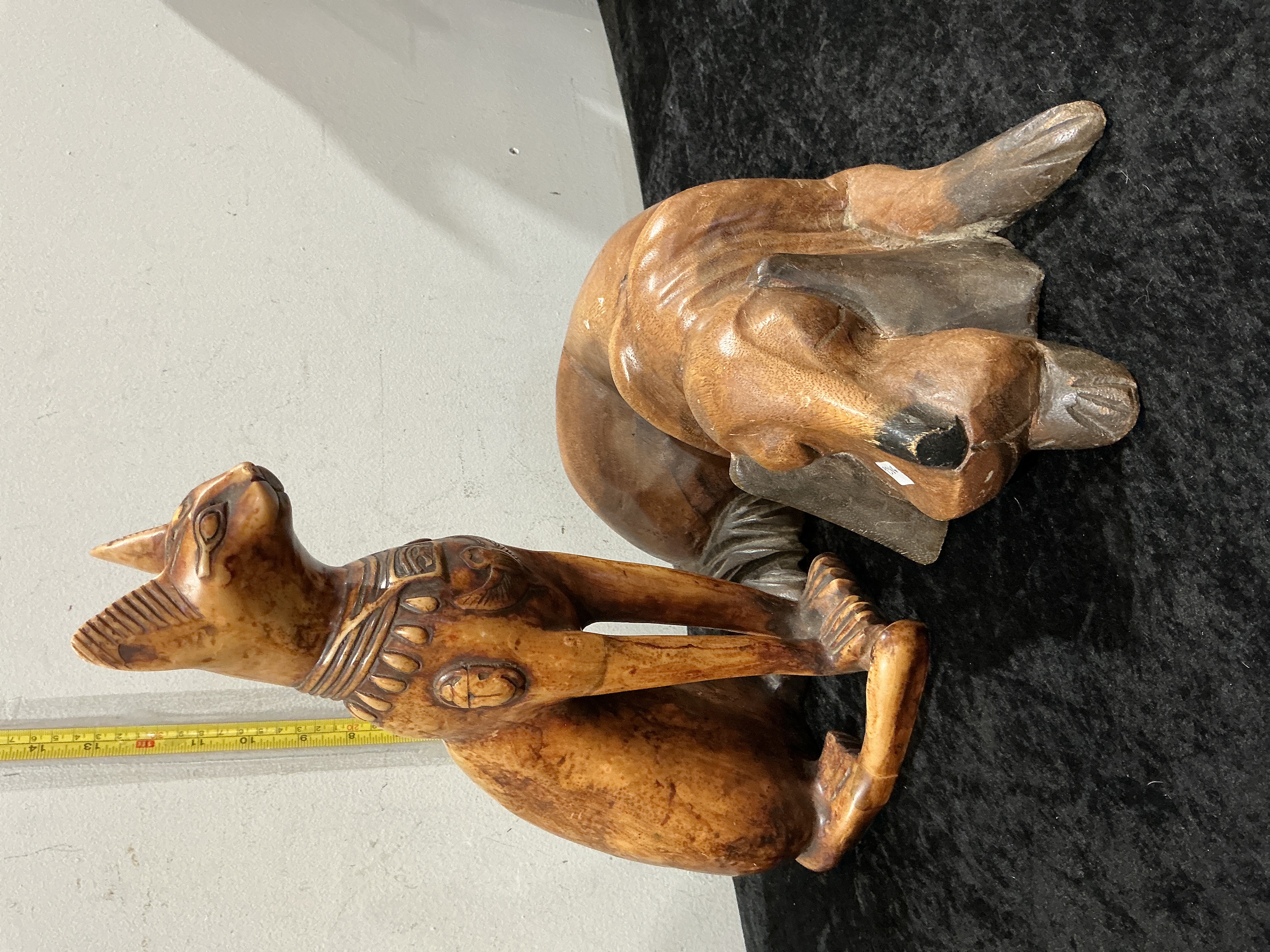 A pair of 20th-century carved wooden animal sculptures, comprising a seated cat and a stylised recumbent hound. The cat is carved in the Egyptian Revival style, featuring a decorative pectoral collar with a scarab motif and stylised facial features. The piece is finished with a polished honey-toned patina. Web research identifies this style as consistent with Mid-Century Modern hand-carved wood figures, often produced in teak or walnut during the 1960s. The hound is rendered in a minimalist, smooth-form style with contrasting dark stains applied to the muzzle, ears, and paws. Neither sculpture displays visible signatures, maker’s marks, or edition numbers.