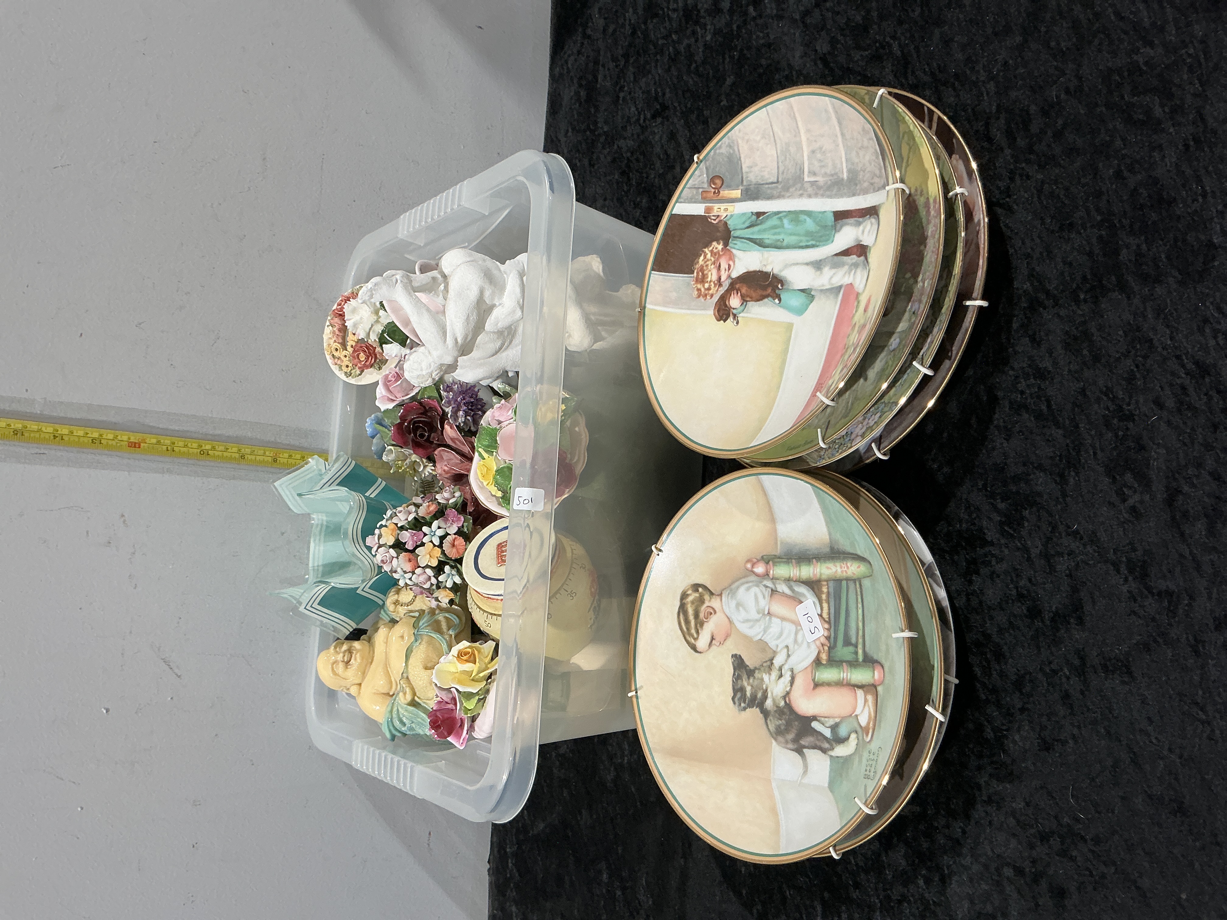 A collection of decorative ceramics and porcelain collector plates, contained within a plastic storage bin and two separate stacks. The lot includes approximately 6-8 circular porcelain collector plates featuring transfer-printed illustrations of children and dogs bearing the printed signature of Bessie Pease Gutmann. These plates feature gilded rims and are fitted with wire spring-tension hangers. Based on web consensus, these illustrations are associated with collector series such as Days Gone By issued by the Hamilton Collection, Danbury Mint, or Reco.