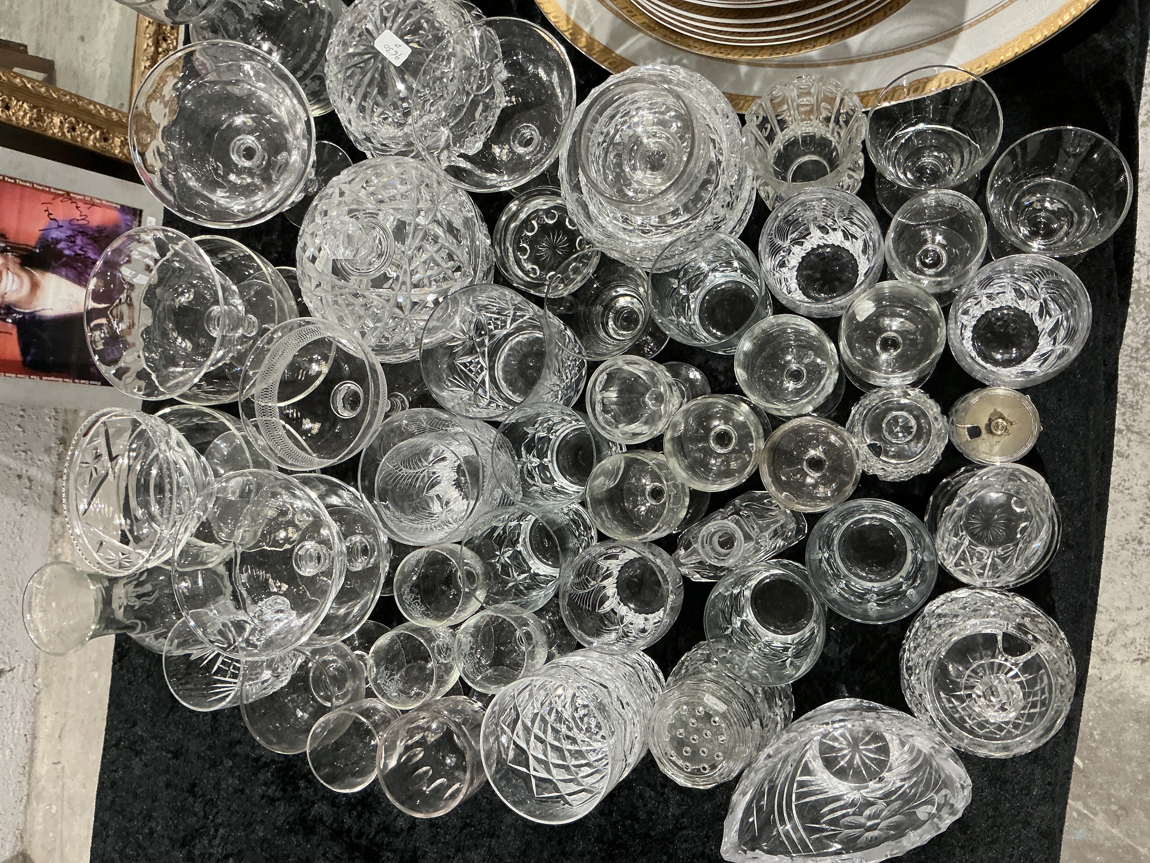 A comprehensive mixed collection of clear glassware comprising approximately 45-50 pieces of various forms and styles. The lot primarily consists of stemware, including champagne coupes, wine glasses of various sizes, and small cordial or spirit glasses. Also included are several bowls, including a notable boat-shaped oval bowl with an etched and cut floral design and fan-cut edges, small tumblers, a perforated glass shaker, and a small cylindrical vessel with a silver-toned metal lid. The collection exhibits a wide range of decorative techniques, featuring deep geometric diamond-point and criss-cross cutting patterns, some of which are in the style of Waterford Lismore. Many of the stems feature starburst or radial cuts to the underside of the feet. A portion of the stemware, particularly the coupes, is plain-bodied, with some featuring simple etched bands or faceted stems. One glass bears a small, circular white adhesive sticker with the handwritten numerals 9630. The quality of the pieces varies from standard pressed glass to hand-cut lead crystal. No legible maker’s signatures, brand marks, or logos were observed during inspection.