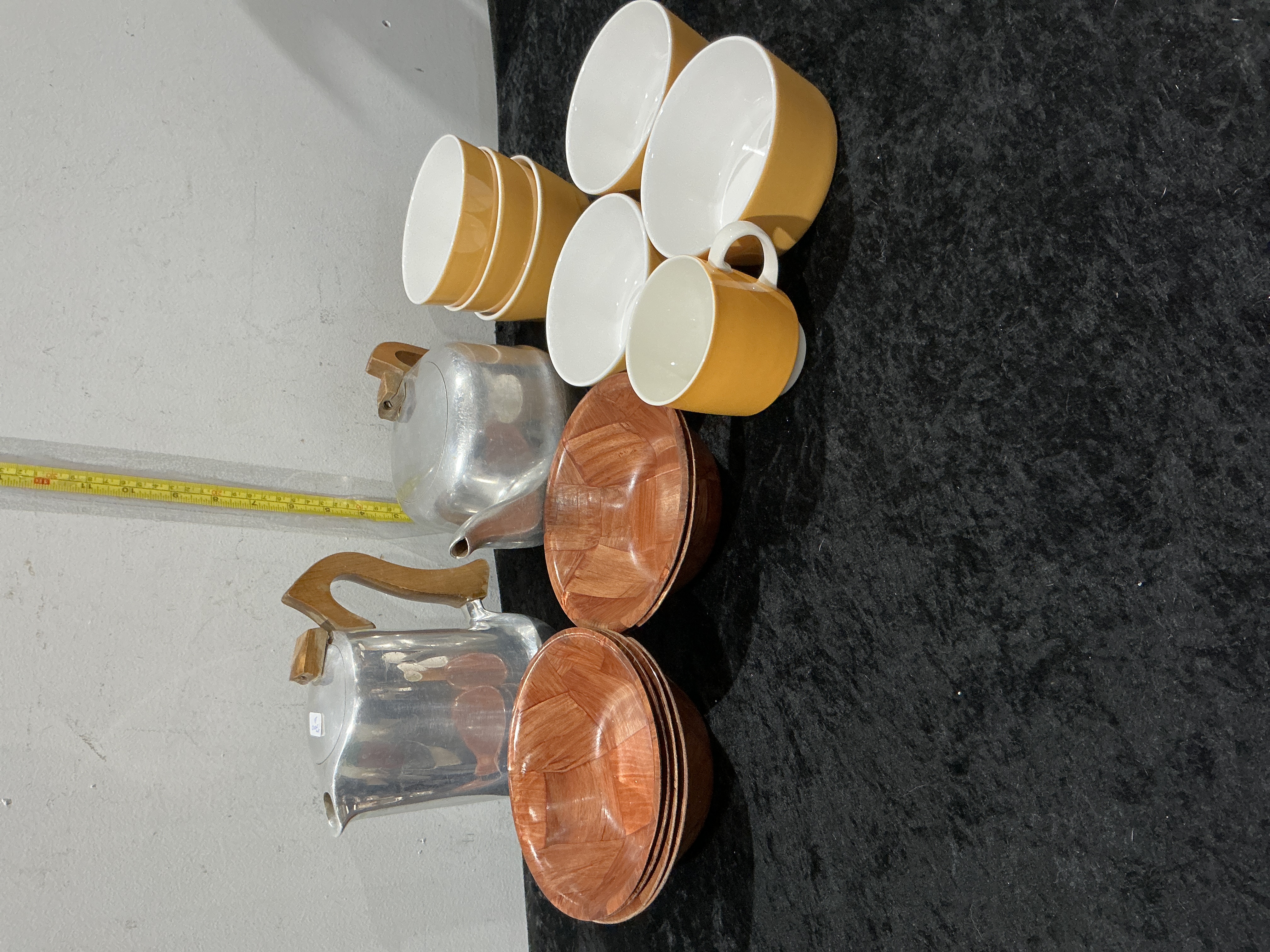 A collection of mid-century modern style kitchenware and tableware. The group includes two polished cast metal vessels, likely aluminium or a similar alloy, consisting of a tall coffee pot and a squat teapot. Both vessels feature carved wooden handles and lid finials in a style characteristic of mid-20th-century British design. Accompanying these are several ceramic pieces, including small bowls and a mug, finished with a yellow exterior and white interior glaze. The lot also contains multiple small bowls featuring a woven wood-grain or laminate finish. No maker’s marks, signatures, or hallmarks are visible on the surfaces.