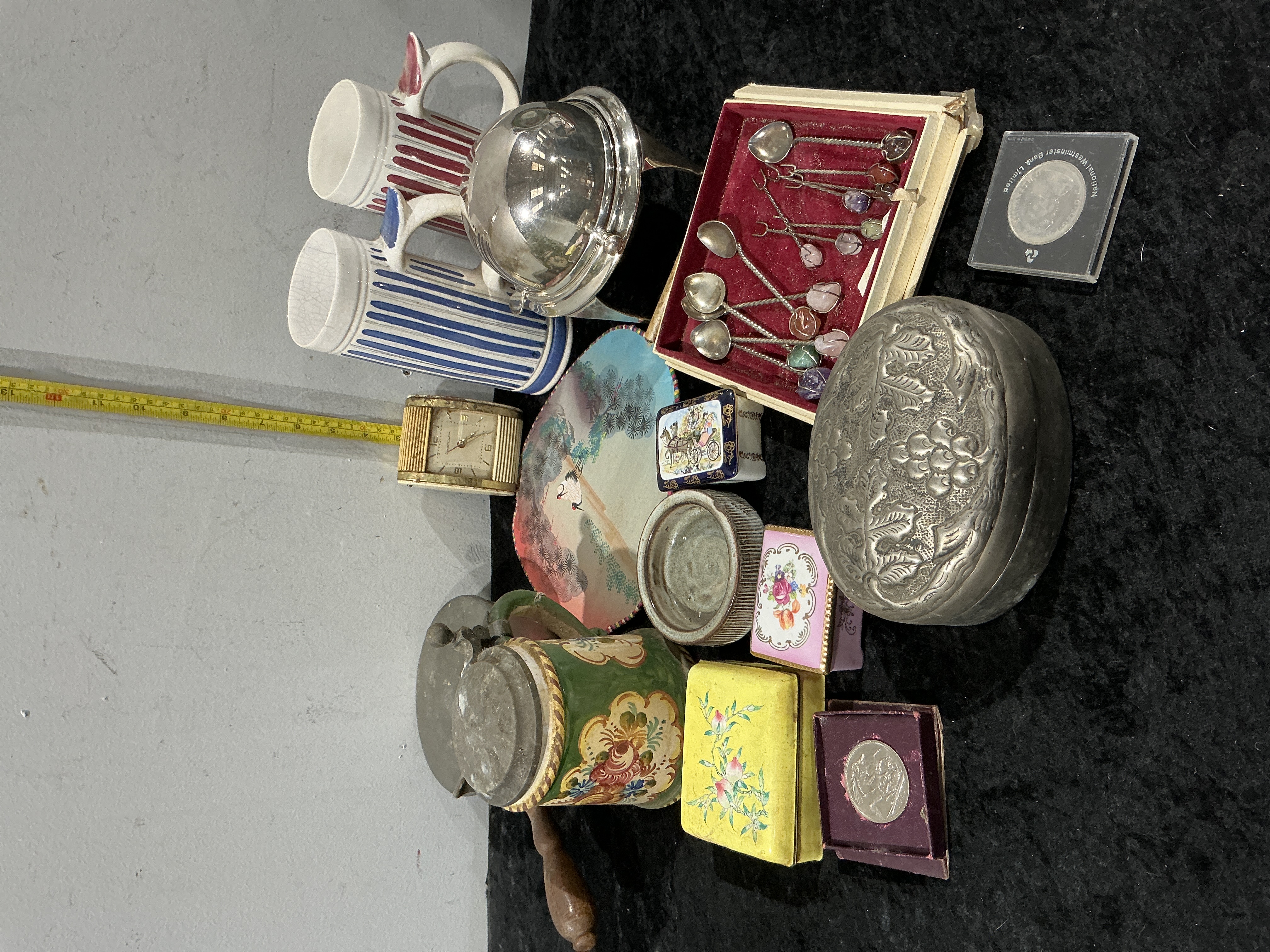 An assortment of decorative items and household collectibles. The group includes a silver-plated revolving breakfast dish featuring a domed lid and four supports. Also present is a cased set of silver-tone spoons, each set with various semi-precious stone finials. Metalware further comprises an oval embossed box decorated with foliate and berry motifs and a rectangular brass-toned desk clock with an integrated alarm function. Ceramic items include two mugs with vertical stripes in red and blue colourways, a lidded stein with hand-painted floral motifs on a green ground, and a small plate depicting a landscape scene. The collection also features several small porcelain trinket boxes with floral and figurative designs, including one yellow-finished box and one with a carriage scene. Additional items consist of a small ridged ceramic vessel and two commemorative coins, one of which is housed in a plastic case inscribed National Westminster Bank Limited.