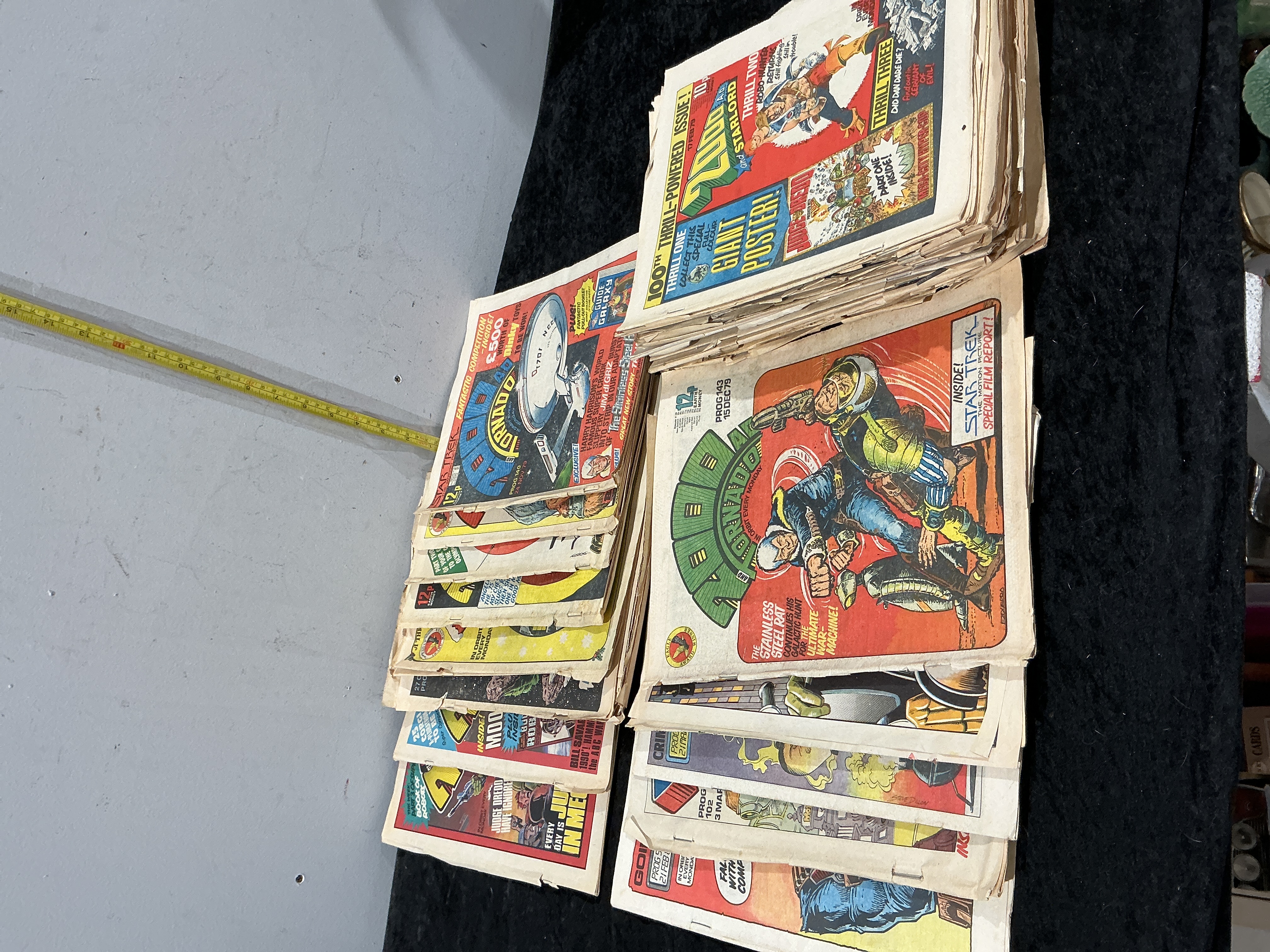 A collection of original British weekly science fiction comic anthologies published by IPC Magazines, dating from 1979. The lot comprises an estimated 60 to 100 plus issues, primarily featuring 2000 AD and Starlord and Tornado titles. Identified issues include 2000 AD and Starlord Prog 100 (17 February 1979), which is a centennial issue featuring Judge Dredd, alongside Progs 101 (24 February 1979), 102 (3 March 1979), and 111 (5 May 1979). Tornado issues include Prog 140 (24 November 1979) featuring a Star Trek cover tie-in and Prog 143 (15 December 1979). The cover of Tornado Prog 143 is signed by artist Carlos Ezquerra in the lower right corner. The comics feature recurring characters and stories including Judge Dredd, Ro-Busters, and The Stainless Steel Rat. These are standard UK newsstand editions printed on newsprint.