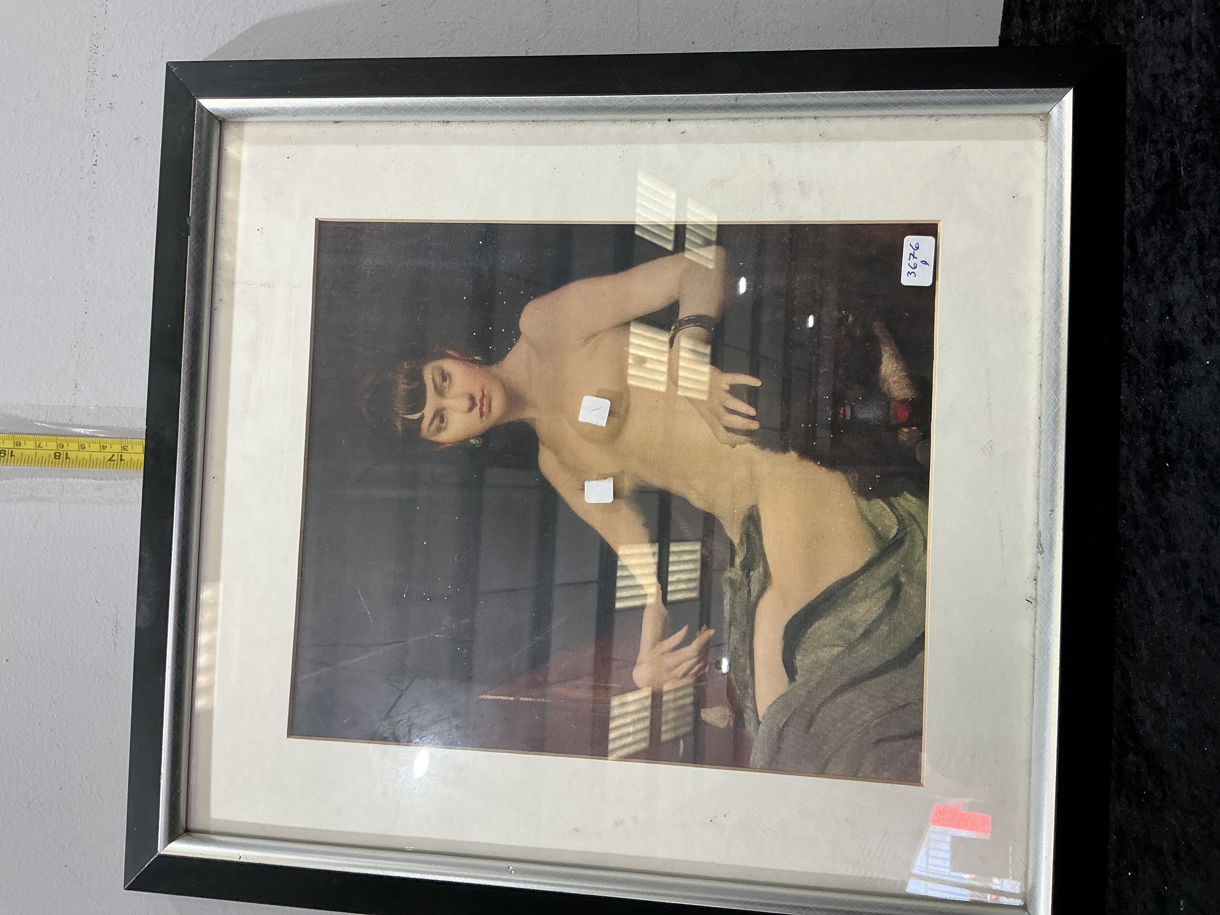 A modern colour reproduction print after an original oil painting depicting a seated female nude. The subject is portrayed semi-draped in a green cloth and looking directly at the viewer. No edition number, signature, or publisher’s stamps are visible on the face of the work. The print is presented in a modern black and silver-toned frame with an off-white mount. A small blue-bordered sticker is applied to the top right of the mount bearing the handwritten digits 3676. Two white stickers are applied to the exterior of the glass over the subject’s chest.