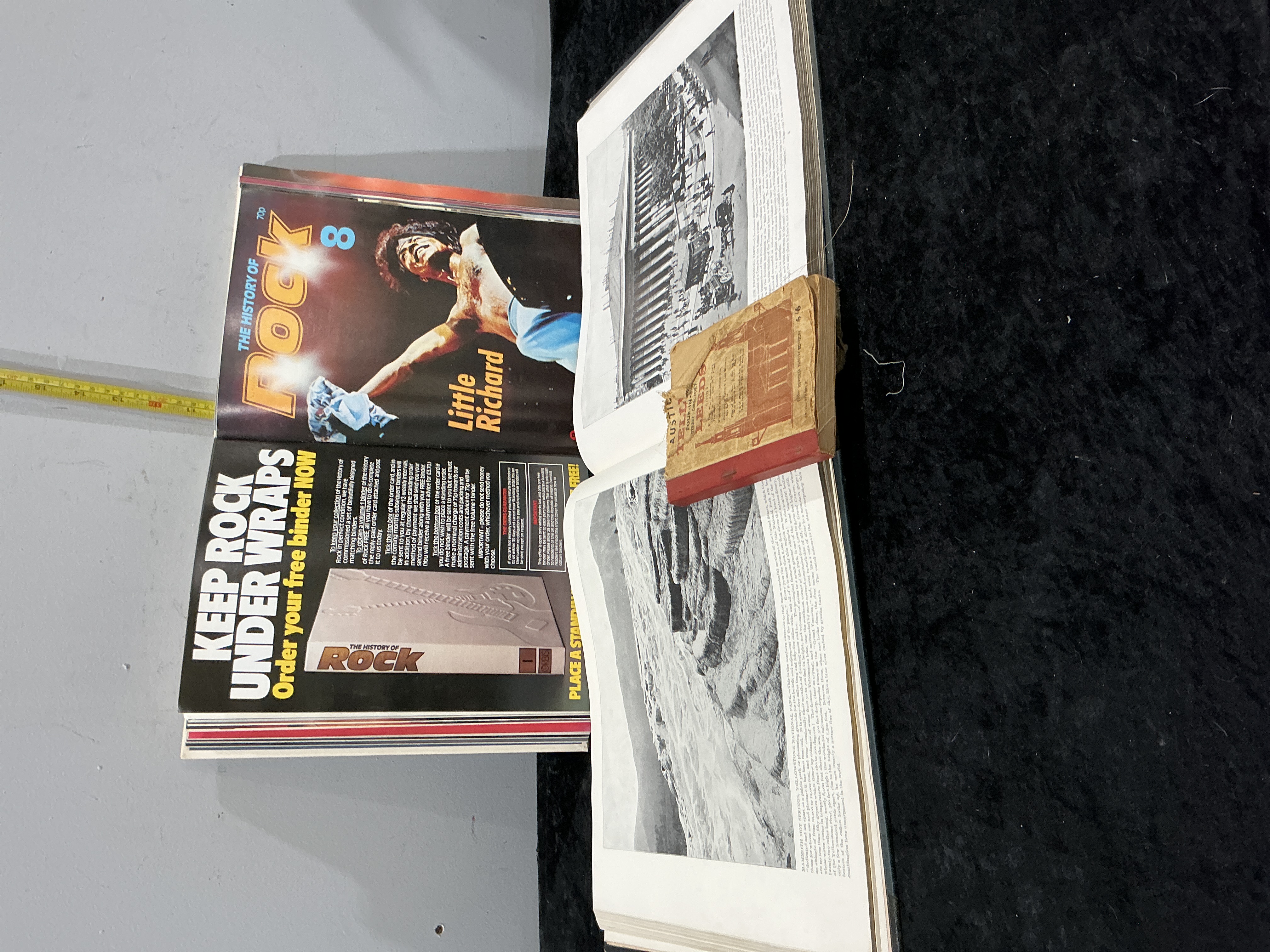 This lot consists of three distinct printed items. The first is a copy of The History of Rock magazine, issue number 8, published by Orbis Publishing circa the early 1980s. The front cover features Little Richard and carries a cover price of 70p. The reverse includes an advertisement for the series’ dedicated binders. The second item is a small-format paperback guidebook titled Austick’s Guide to Leeds, Revised Sixth Edition, published by Austick’s of Leeds with a cover price of 1/6. The third item is a large-format hardcover book containing high-quality black and white photographic plates. Visible subjects within the open volume include a classical Greek-style colonnade and a landscape identified as Mammoth Hot Springs, Yellowstone National Park. The text accompanying the plates suggests a mid-20th-century geographical or architectural survey.