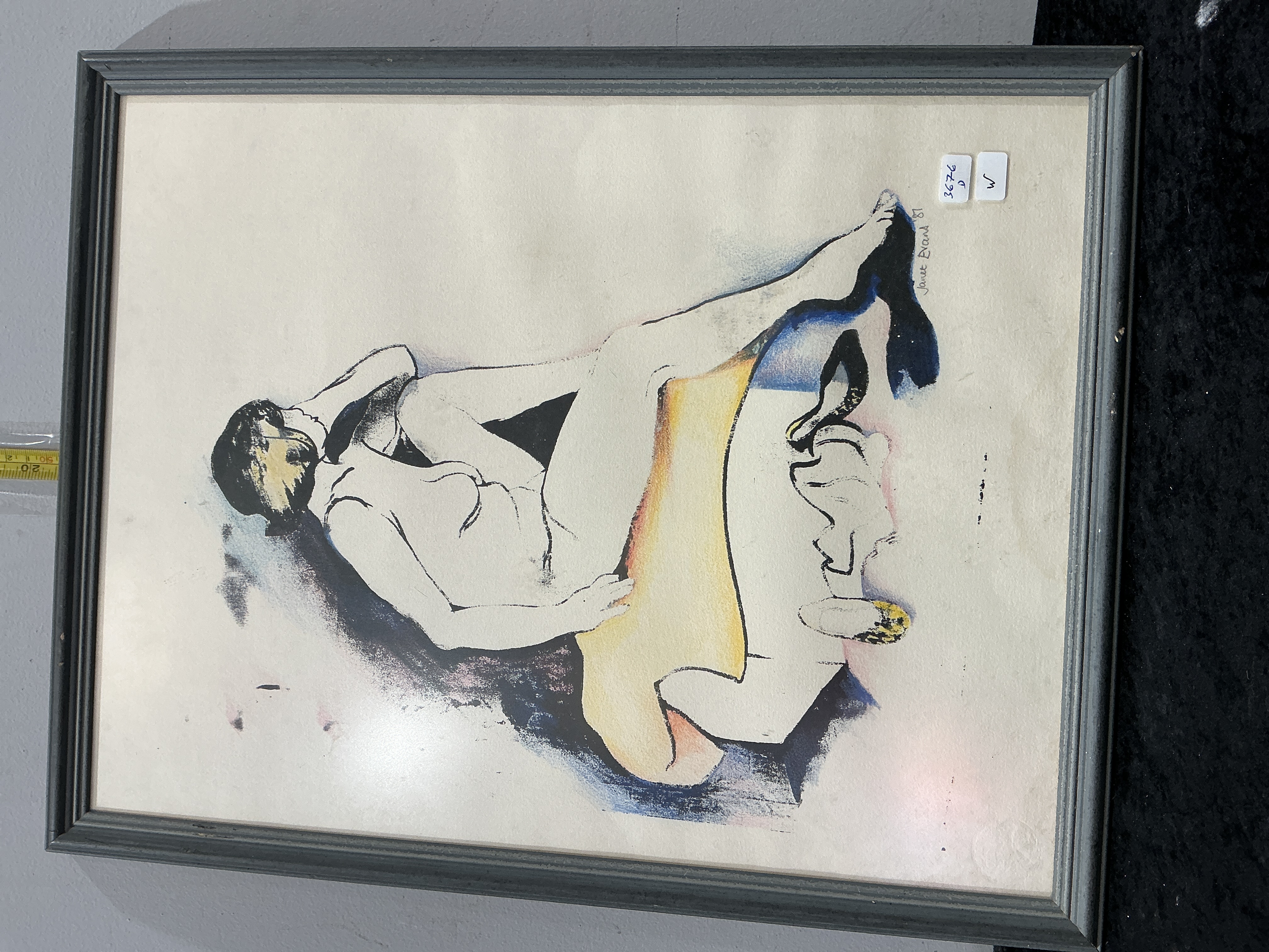 This figurative study by Janet Evans depicts a reclining female nude in a modern, illustrative style. The work is executed in black ink or charcoal line with water colour washes of blue, yellow, and orange on cream wove paper. The composition utilizes expressive line work and subtle tonal washes to define the form. It is signed vertically along the right-hand margin: Janet Evans ’81. The piece is housed in a simple grey-painted wooden frame under glass.