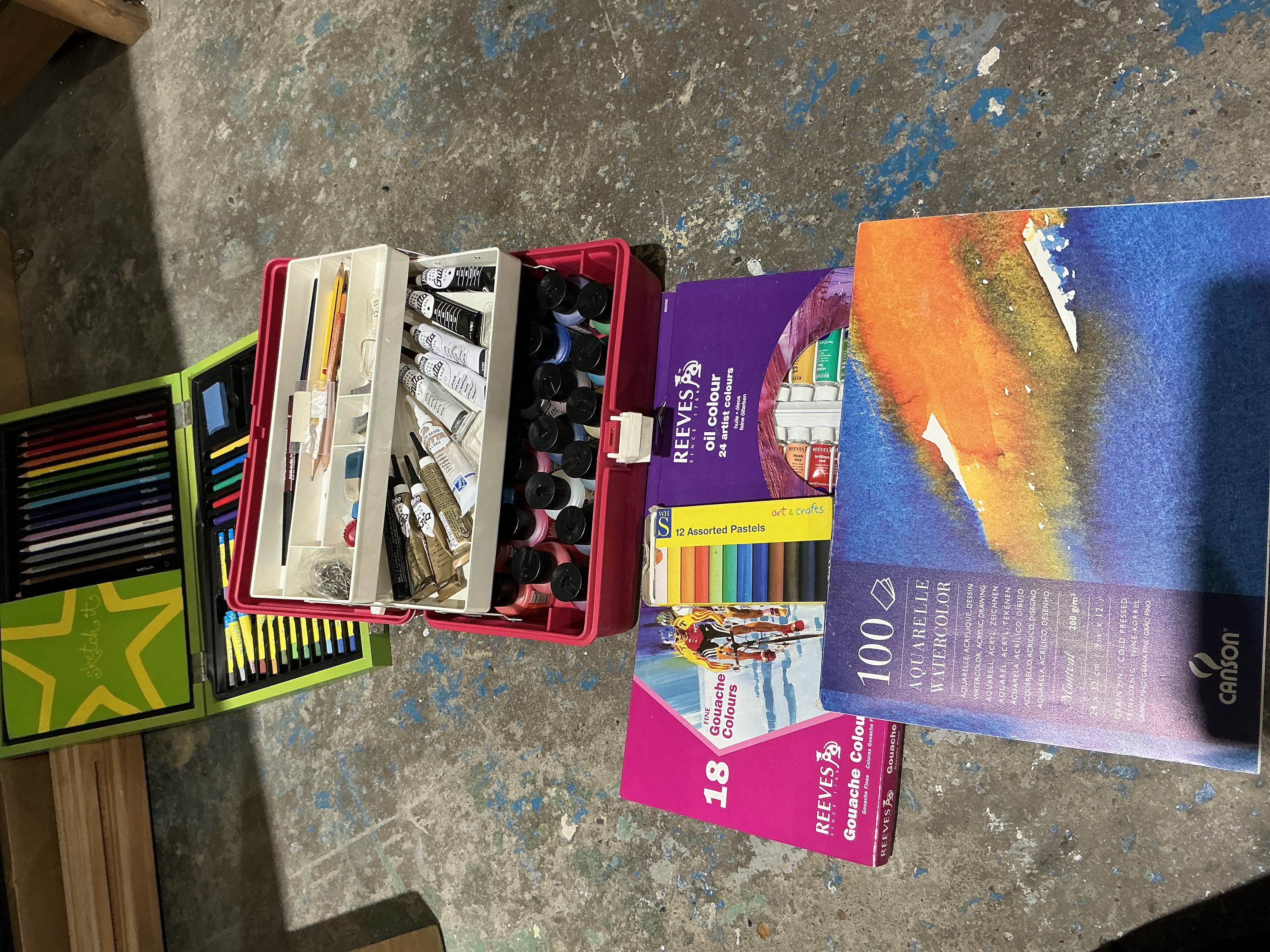 A collection of various artist supplies and media. The group includes a red plastic multi-tier cantilever art box containing assorted tubes of paint, brushes, and accessories. Also included is a green folding Sketch It kit containing a variety of coloured pencils. Boxed sets comprise Reeves oil colours (24 artist colours), Reeves fine gouache colours (18 count), a WHSmith set of 12 assorted pastels, and a Canson Aquarelle watercolour paper pad. The items feature printed manufacturer marks for Reeves, Canson, and WHSmith.