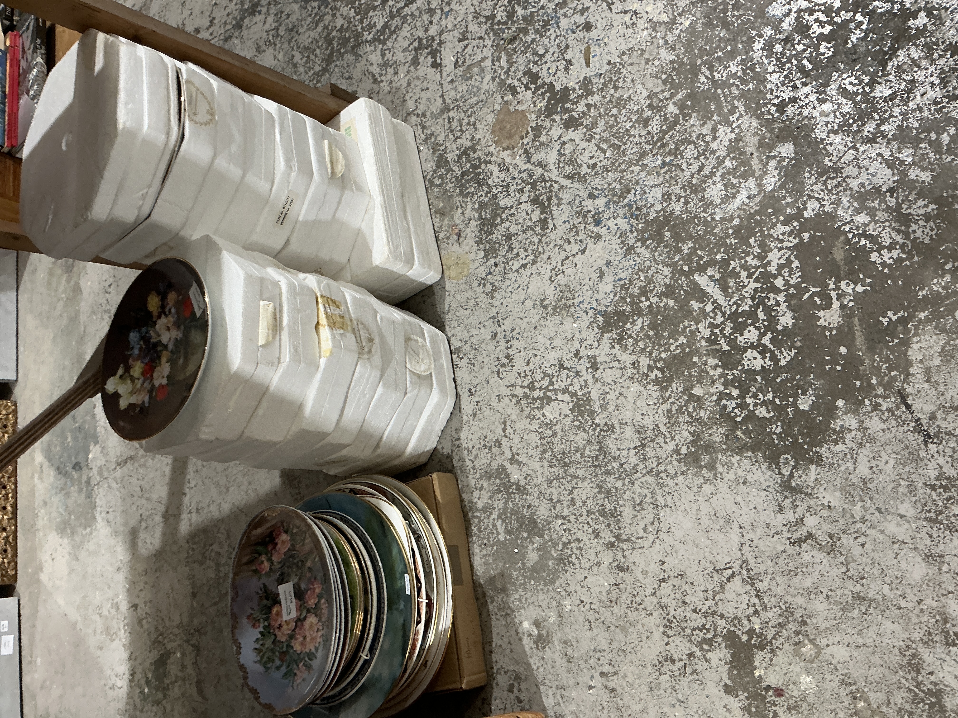 A collection of decorative porcelain or fine bone china collector plates featuring various floral motifs. The plates are decorated with transfer-printed designs; one example depicts a bouquet of multi-coloured flowers on a dark ground with a gilded rim, while another shows a central cluster of pink roses against a pale blue ground. A significant portion of the collection is housed in original white polystyrene protective cases, stacked in columns, with further loose plates stacked on a cardboard base. Labels on the packaging are printed with PART No: 8011011 and VENDOR No: 61161. No maker marks are visible on the ceramics.