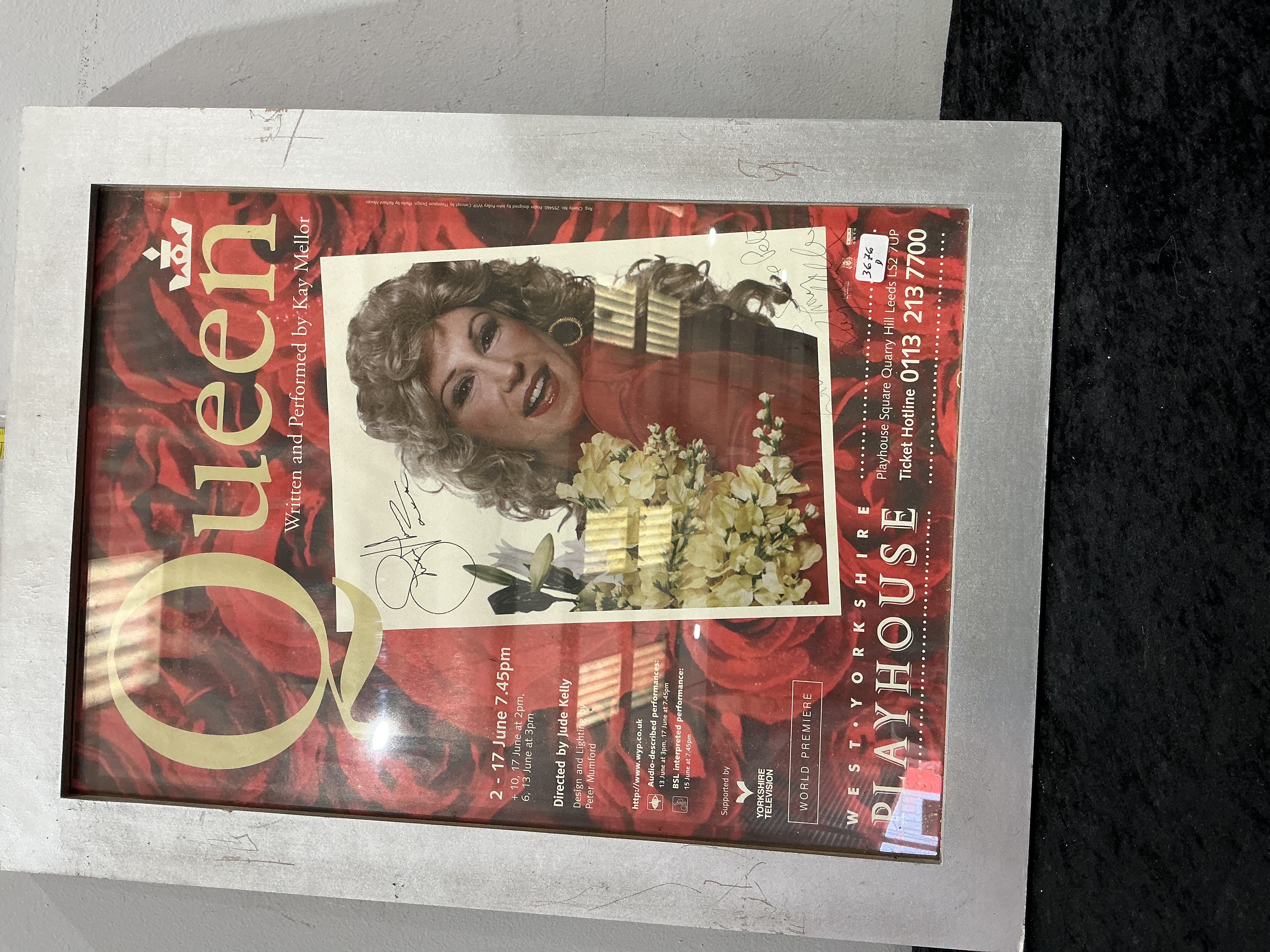 A framed promotional poster for the world premiere of the play Queen, written and performed by British dramatist and actress Kay Mellor. The production was staged at the West Yorkshire Playhouse, Leeds, with performance dates listed as 2 to 17 June. The graphic design features a central photographic portrait of Mellor holding a bouquet of yellow flowers, set against a background of large red roses. The item is signed in black ink by Kay Mellor to the left of the central portrait. Two additional illegible signatures or handwritten marks in black ink are present, one located below the Mellor signature and another to the upper right of the portrait. Printed production credits include director Jude Kelly, design and lighting by Peter Mumford, poster design by John Finlay, concept by Thompson Design, and photography by Richard Moran. A small white adhesive label with the handwritten reference 3676 D is present on the lower right of the glazing.