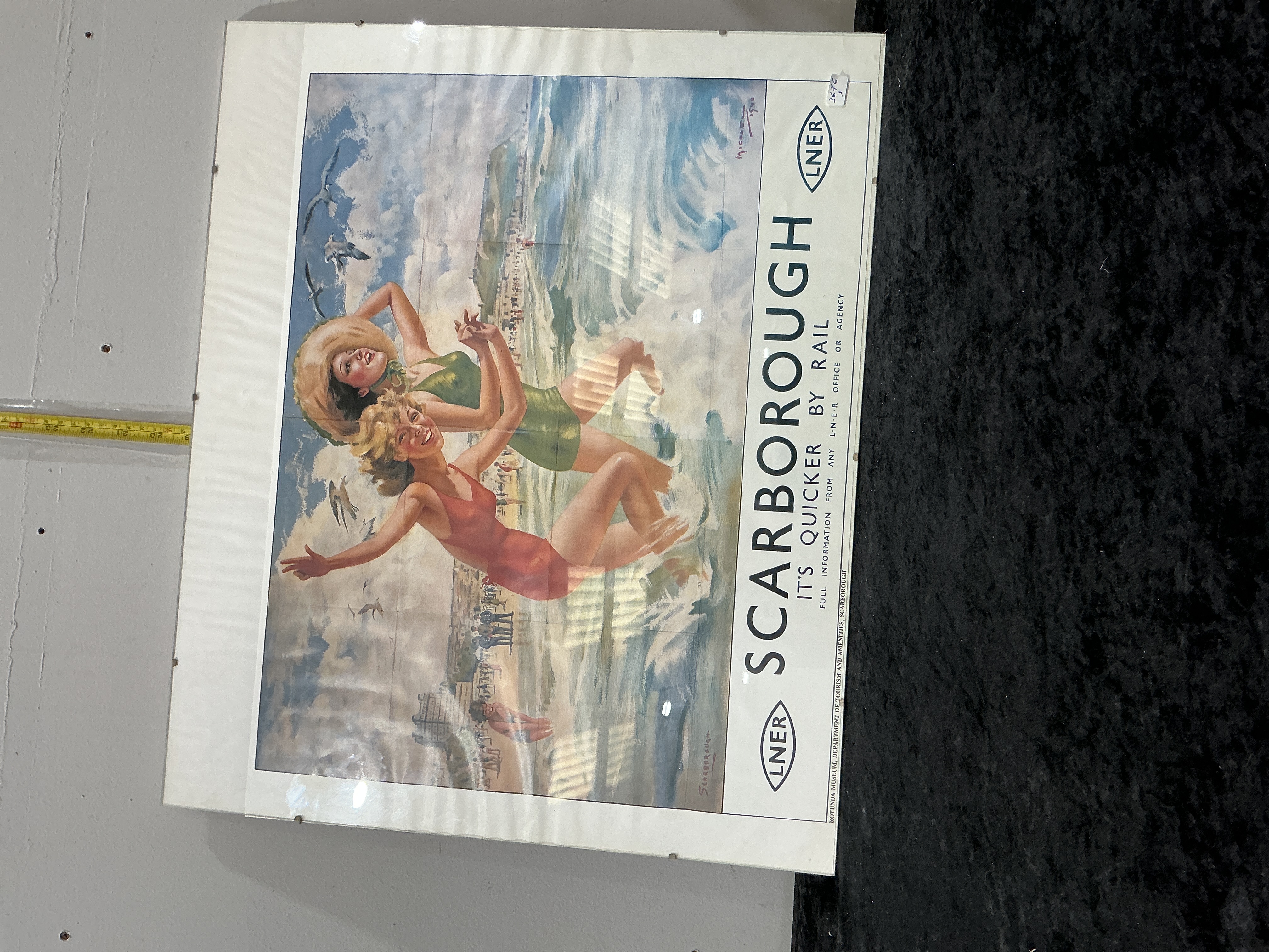 A railway advertising poster for Scarborough, North Yorkshire, produced for the London and North Eastern Railway (LNER). The design is after the artist Hird and is dated 1950 in the upper right of the image area. The illustration depicts two women in period swimwear running through the surf on a beach. The poster features vertical blue block lettering for the location name, accompanied by the slogan IT’S QUICKER BY RAIL and LNER eye-shaped logos. The lower margin bears the inscription ROTUNDA MUSEUM, DEPARTMENT OF TOURISM AND AMENITIES, SCARBOROUGH, identifying this as a museum-issued commemorative print. A small white adhesive label with the handwritten digits 3676 is located in the top right corner.