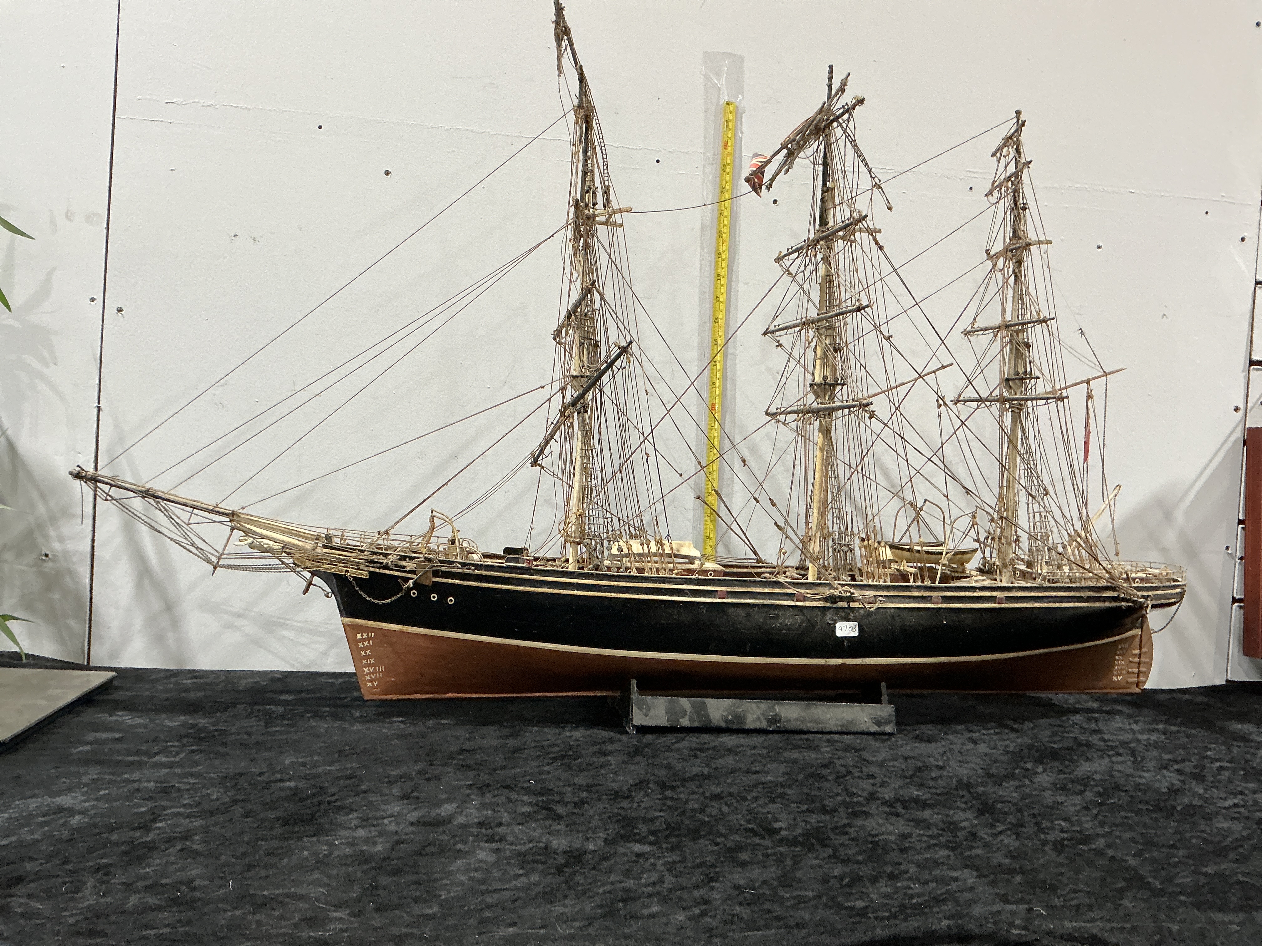 A large-scale wooden model of a three-masted sailing vessel, constructed in the style of a 19th-century clipper or merchant ship. The wooden hull is finished in black with a reddish-brown lower section, separated by thin gold-toned banding. The bow and stern feature incised Roman numeral draught marks, with the bow marked XXII through XV and the stern marked XXI through XV. The model is equipped with a full suite of masts, a bowsprit, and extensive cord rigging. Deck details include miniature lifeboats and railings. A small adhesive label with the handwritten number 4708 is located on the port side of the hull. The vessel is presented on a simple black wooden cradle stand.