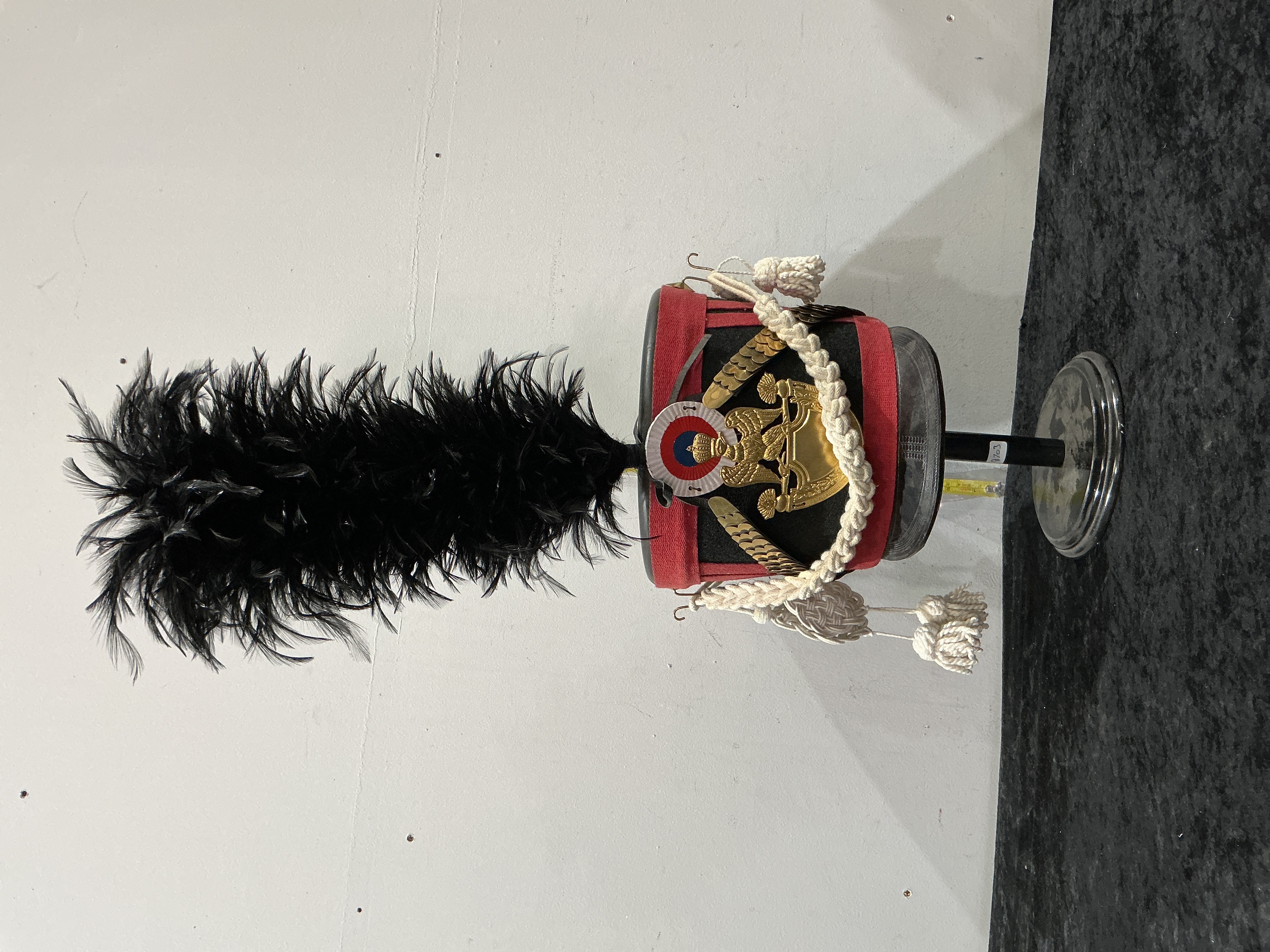 This item is a modern replica of a French infantry shako designed in the style of the Second Empire period under Napoleon III. The body is constructed from black fabric and features red wool piping and decorative bands at the upper and lower margins. The front is adorned with a stamped gilt brass shako plate depicting an Imperial eagle with outspread wings perched upon a thunderbolt. The rectangular plaque at the base of the eagle is stamped with the numeral 1, representing the 1st Infantry Regiment. Positioned above the plate is a circular tricolour cockade in the French national colours of red, white, and blue. The headgear is further embellished with a tall black feather plume and white braided cords with hanging tassels. A pair of gilt metal chin scales are present and secured in the raised position across the front of the body. A modern inventory label bearing the digits 4703 is attached to the display stand.