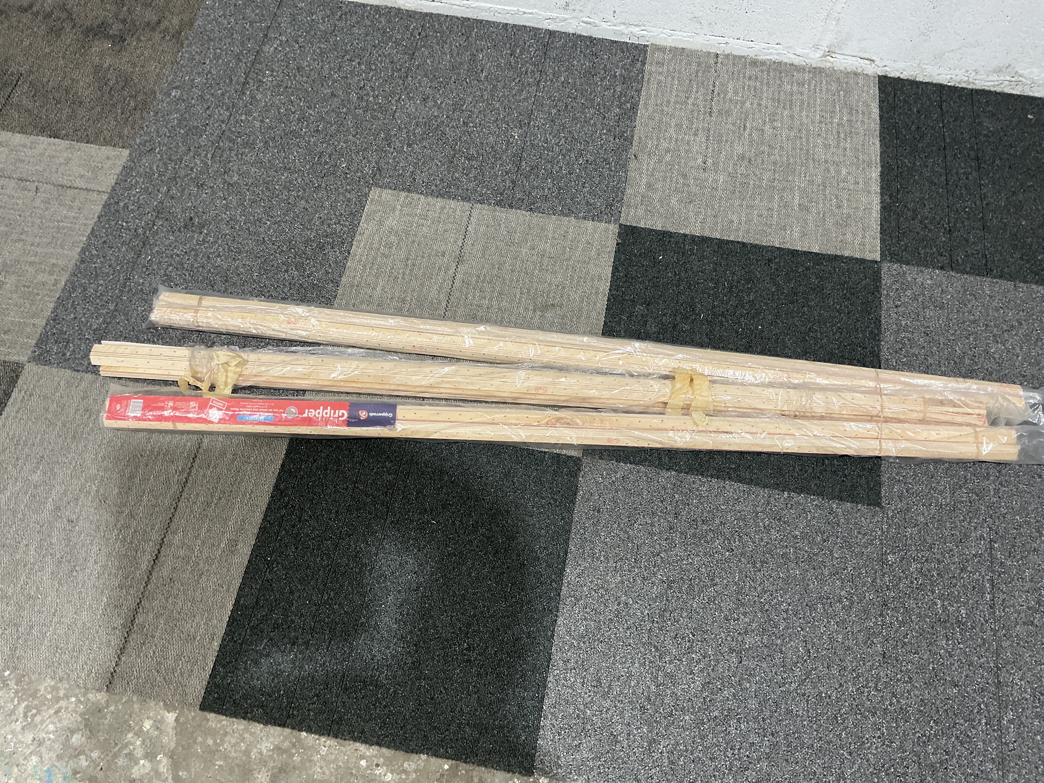 A collection of wooden carpet gripper rods manufactured by Gripperrods. The lot consists of several bundles of wooden tack strips, each featuring pre-installed metal pins designed for securing carpet during installation. One bundle retains the original manufacturer’s red and blue paper label with the brand name Gripperrods clearly visible. The items are constructed from wood and are housed in clear plastic sleeves.
