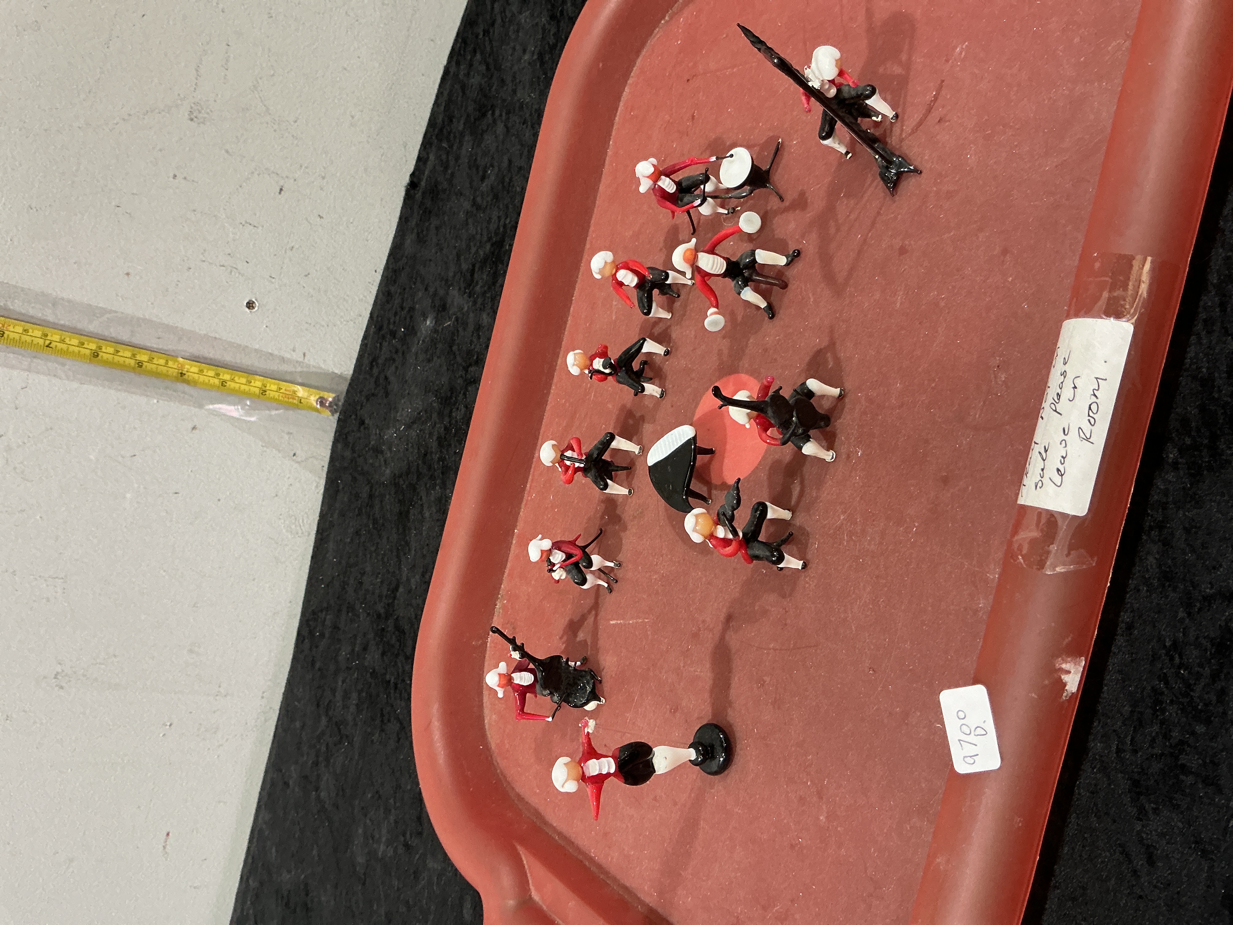 A collection of lampworked glass figurines depicting a musical ensemble, identified as a Murano glass band. The figures are constructed from opaque red, black, and white glass, with translucent amber glass used for the heads. Each musician is styled with an elongated form, wearing a red jacket and white headwear. The group includes various instrumentalists such as a pianist at a grand piano, a drummer with a white drum kit, and players of string and wind instruments. These miniatures are characteristic of mid-20th-century Venetian lampwork techniques. No maker marks, signatures, or labels are visible on the pieces.