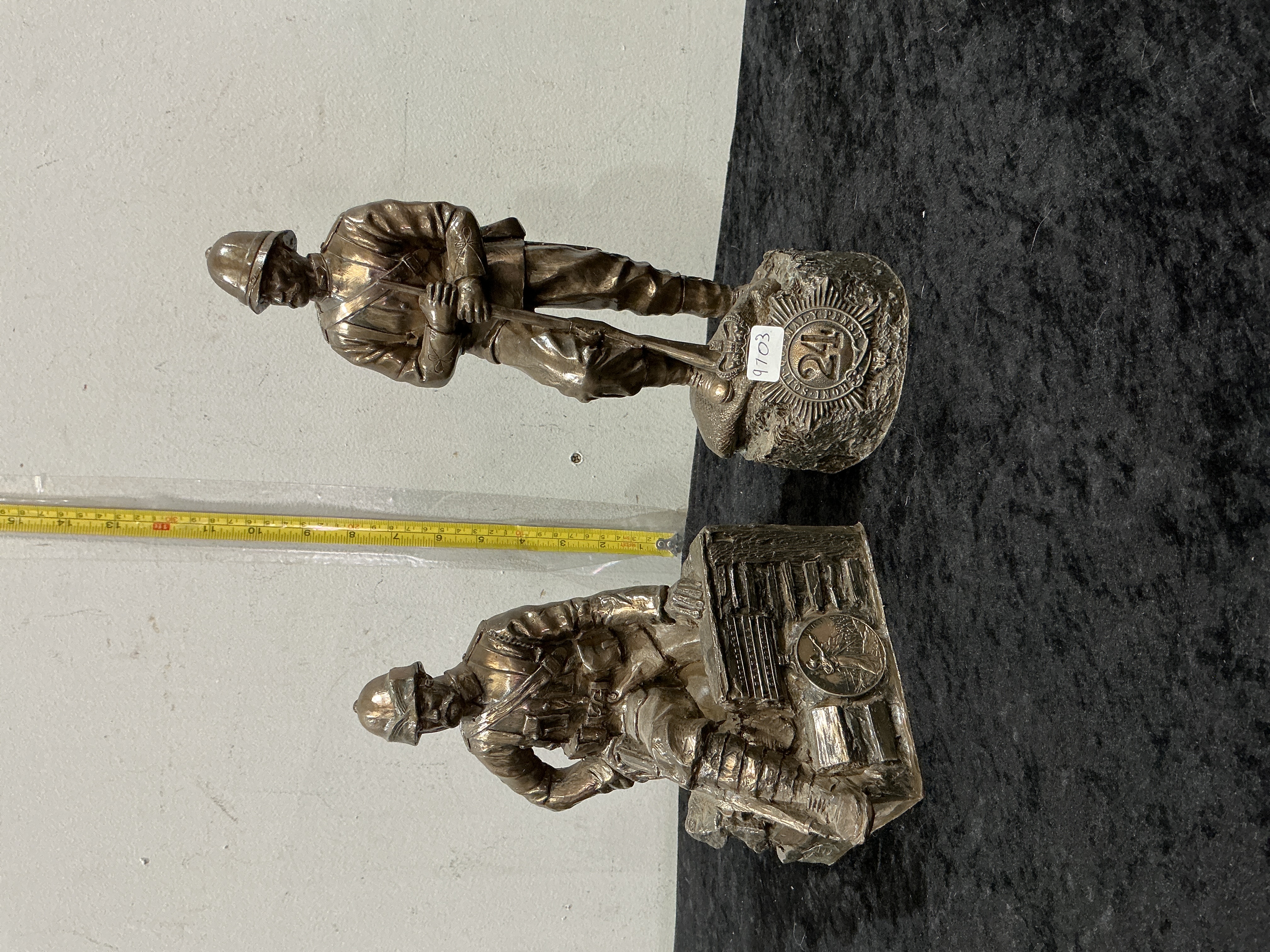 Two cast metal commemorative figures depicting British soldiers from the Second Boer War period. The first figure depicts a standing infantryman in service dress, wearing a foreign service helmet and bandolier, while holding a rifle. The integral circular base is textured and incorporates a regimental cap badge for the 24th Regiment of Foot (South Wales Borderers), featuring the motto HONI SOIT QUI MAL Y PENSE and the numeral 24. The edge of the base is incised with the mark A. W. J. G. 2000. The second figure depicts a seated soldier in similar uniform behind a defensive position of rocks and crates. The base features three rectangular plaques inscribed BELMONT, SPION KOP, and KIMBERLEY. An oval mark with the letters PL is present on the base. The front of the crates displays a circular relief depicting a horse and rider. Both figures are finished with a bronze-effect patina.
