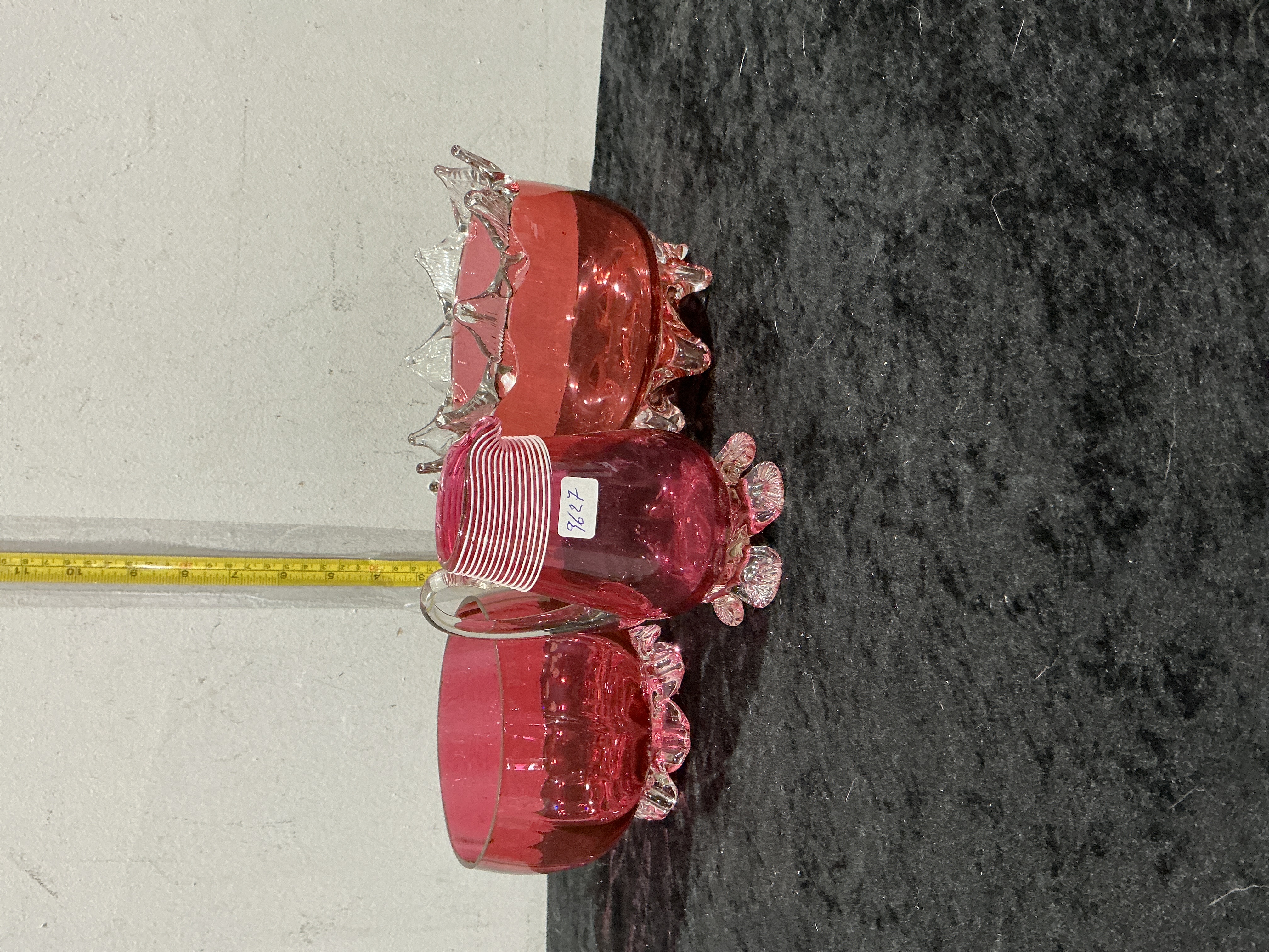 A trio of hand-blown Victorian cranberry glass items, attributed to the Stourbridge region of England, dating to the late 19th century. The collection comprises a footed bowl with a clear glass frilled rim and four applied clear glass shell-form feet; a footed cream jug featuring a clear glass handle, three applied clear glass shell-form feet, and hand-applied white glass threading to the neck; and a footed bowl with a plain rim and four applied clear glass shell-form feet. Each piece is manufactured using gold ruby glass techniques with applied clear glass rigaree. The construction is consistent with period hand-blown glass, typically featuring snapped or polished pontil marks to the base. No permanent maker marks or signatures are present; the jug bears a modern white adhesive inventory label with the handwritten number 9627.