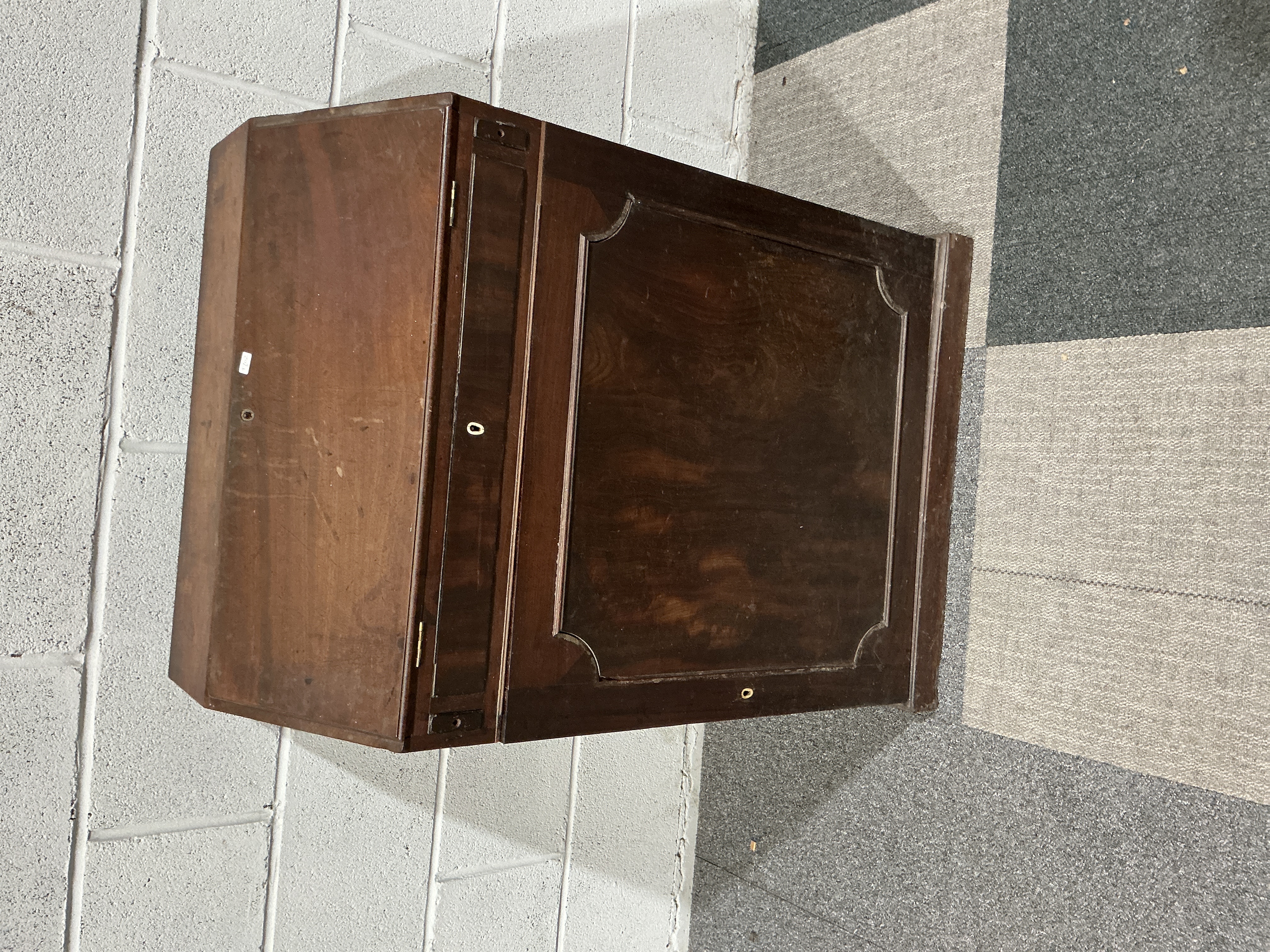 This 19th-century English mahogany secretaire cabinet is designed in the late Georgian style. The upper section features a sloping fall-front that opens to reveal a fitted interior comprising six small drawers, arranged in two sets of three, flanking central open pigeonholes. Each drawer is fitted with a small circular turned knob. The lower section consists of a single large cupboard door with a recessed panel and decorative cusped corners, a design characteristic often found on the trunk doors of Georgian longcase clocks. The piece is constructed with mahogany veneers showing a rich, dark patina. Hardware includes brass hinges and a lock to the interior of the fall-front, with circular escutcheons on the exterior. The writing surface on the interior of the fall-front is currently lacking its leather or baize lining.