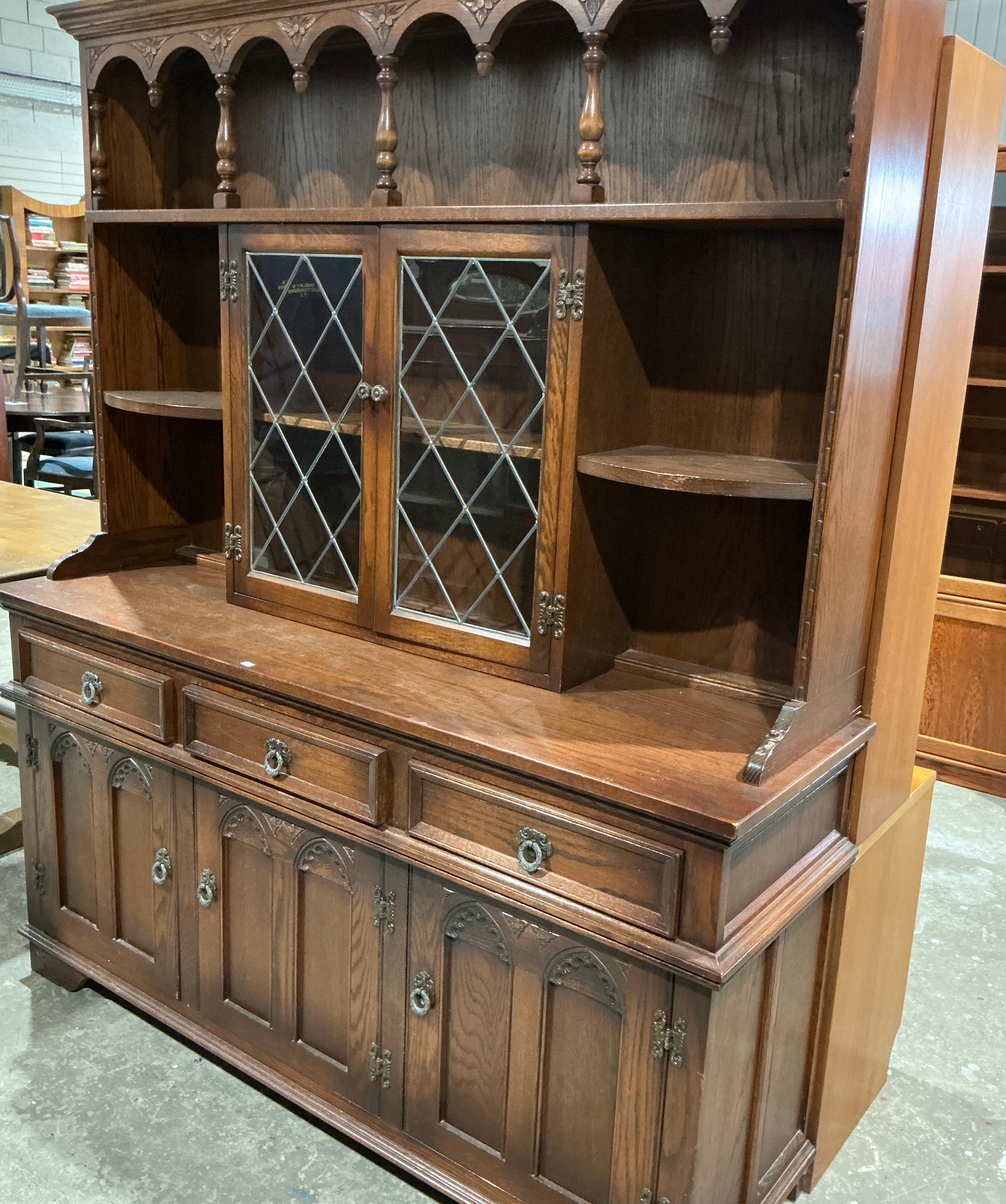 This two-piece Welsh dresser is constructed from stained oak with a visible grain throughout. The upper hutch section features a scalloped top frieze decorated with four turned drop finials. It contains a central double-door cupboard with leaded diamond-pane glazing, flanked on either side by two tiers of open shelving. The base section consists of three drawers over a three-door cupboard. Each cupboard door is decorated with carved arched panels in the Tudor Revival style. The piece is fitted with dark-finished cast metal drop handles and exposed H-style hinges. Small labels are present on the interior and exterior surfaces but are not clearly legible.