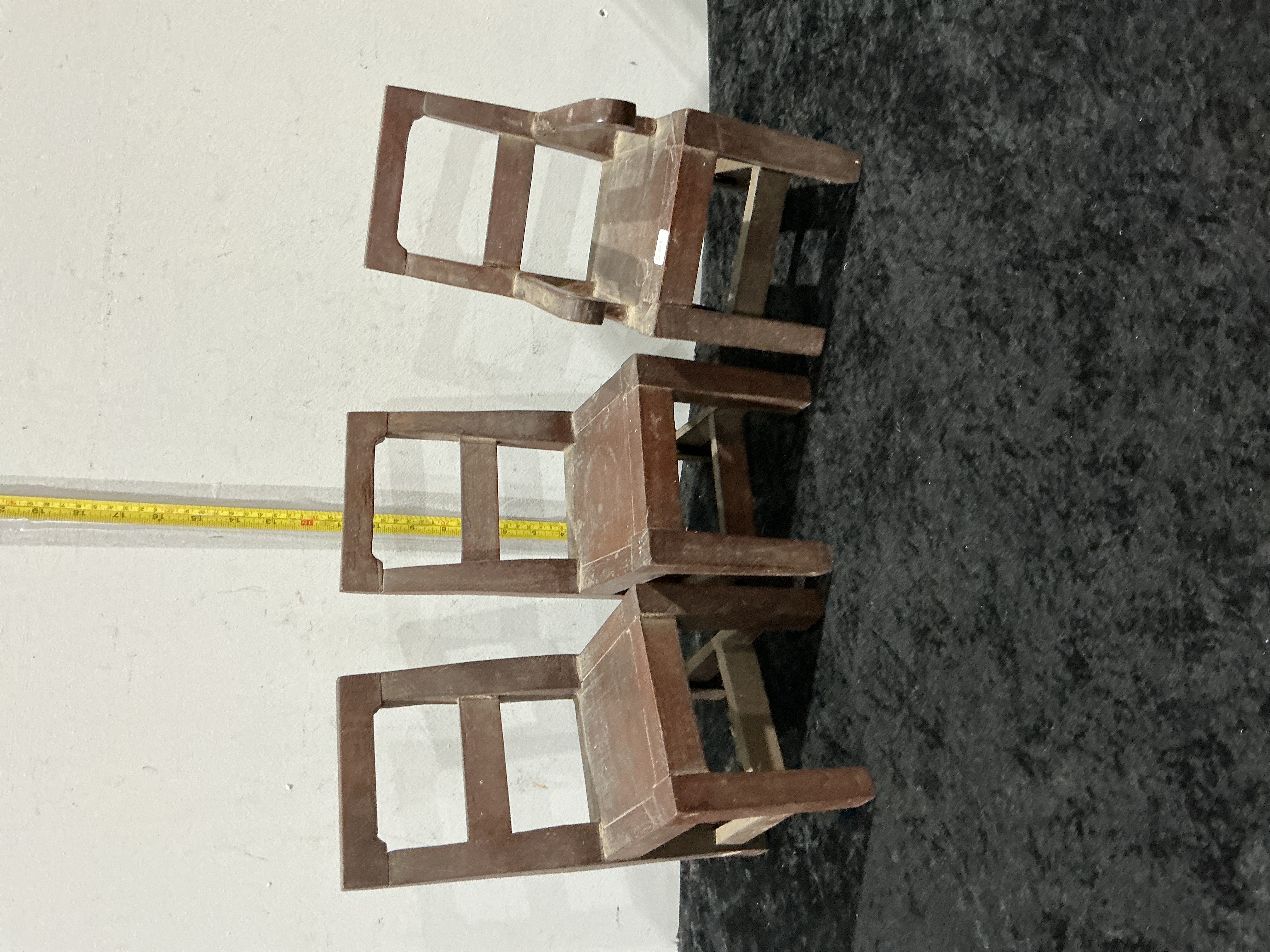 A set of three primitive miniature chairs, comprising one armchair and two matching side chairs. Each chair is constructed from a dark-stained hardwood and features a simple, rustic design. The backrests are open with a rectangular frame and a single horizontal splat. The chairs are built with solid plank seats and supported by blocky, square-section legs. The armchair is fitted with plain, straight-profile armrests. The construction uses straightforward joinery consistent with country-made furniture. A small white adhesive label is present on the side of the armchair seat.