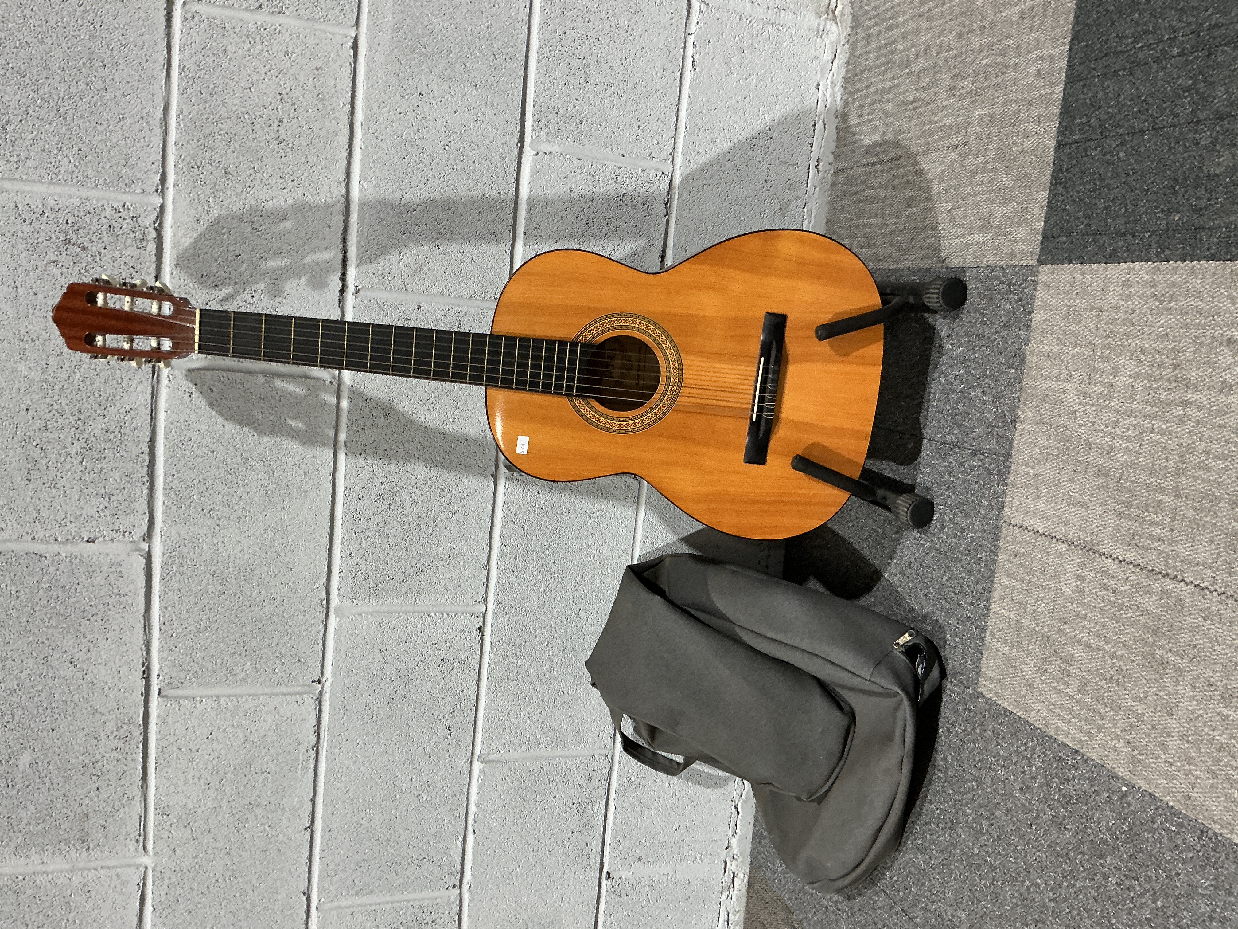 A mid-to-late 20th-century classical acoustic guitar manufactured by Tatra in the former Czechoslovakia. The instrument features a wooden body with a natural finish top and darker stained back and sides. It is constructed with a slotted headstock housing chrome-finished open-gear tuners with white plastic buttons. The fretboard and tie-block style bridge are made from dark-stained wood. An internal rectangular paper label visible through the soundhole identifies the maker as Tatra and specifies the model as number 9198. The guitar is currently fitted with three nylon strings and three metal-wound nylon strings. A small white adhesive sticker with the number 501 is present on the lower bout of the soundboard. This lot includes a black nylon soft-shell gig bag with a carrying handle.