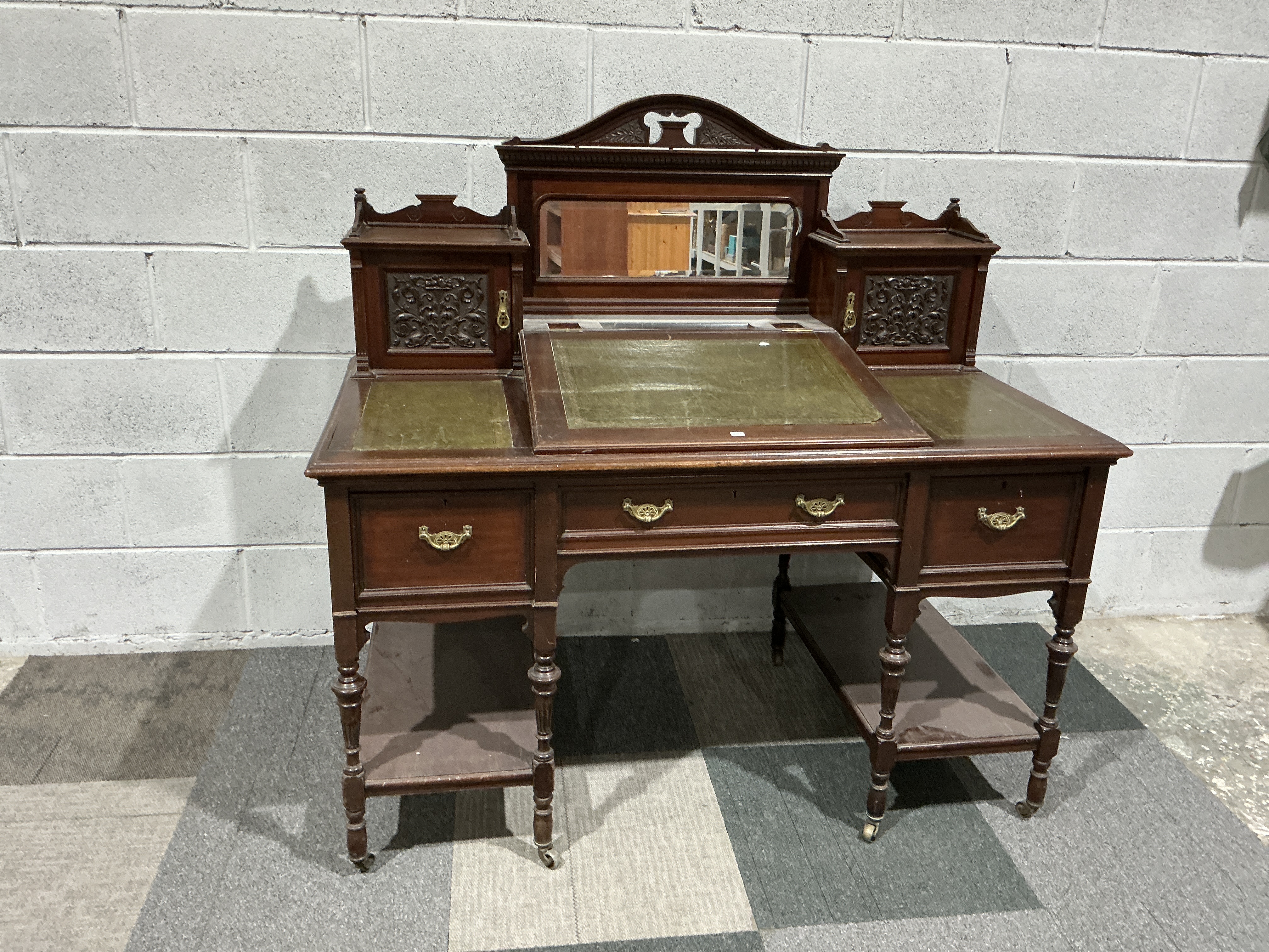 A late Victorian mahogany lady’s writing desk, circa 1890, in the bonheur-du-jour style. The superstructure features a central rectangular mirror plate beneath a shaped cresting rail decorated with a carved lyre motif. The mirror is flanked by two small side cabinets, each containing a cupboard door with an intricately carved foliate panel, surmounted by a small gallery. The main writing surface is inset with three panels of green leather featuring gilded tooling. The central leather-clad section is a hinged slope that opens to reveal a fitted interior. This interior contains a bank of three small drawers with light-coloured wood facings, likely satinwood, and a series of six vertical pigeonhole compartments for stationery. The lower section of the desk features three frieze drawers, each fitted with decorative brass swan-neck handles. The piece is supported by four elegantly turned and fluted legs, which are joined by two lower shelves providing additional storage. The desk is mounted on brass and ceramic casters for mobility.