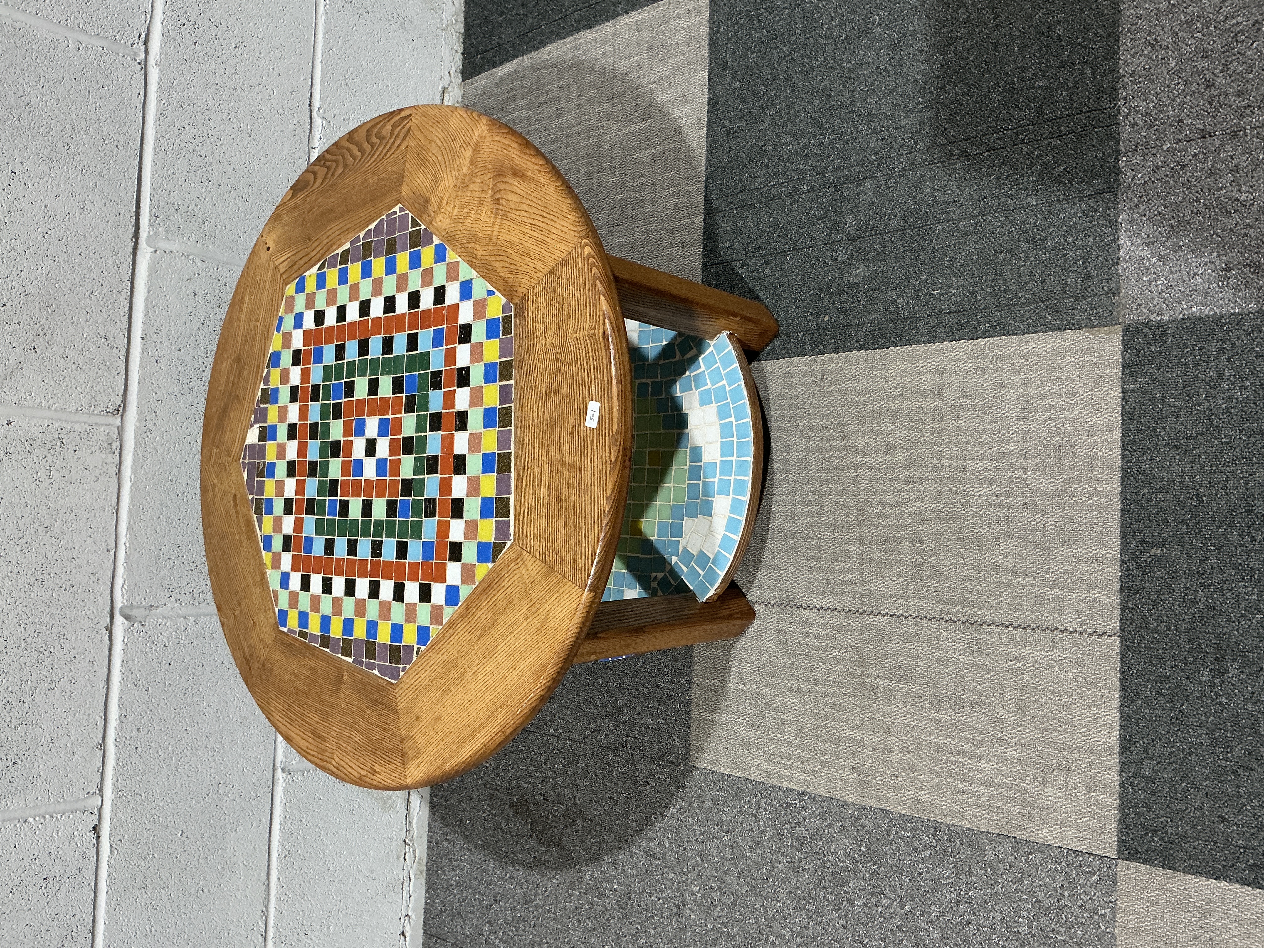 A mid-20th-century oak side or occasional table of circular form. The top consists of an oak frame with an inset octagonal panel of multi-coloured ceramic mosaic tiles arranged in a geometric pattern of concentric rectangular borders in red, green, blue, yellow, and white. The table is raised on four chunky, square-section oak legs which support a lower tier featuring a blue and white mosaic tile surface. A small white rectangular adhesive label with the handwritten characters 105 is present on the top oak border.
