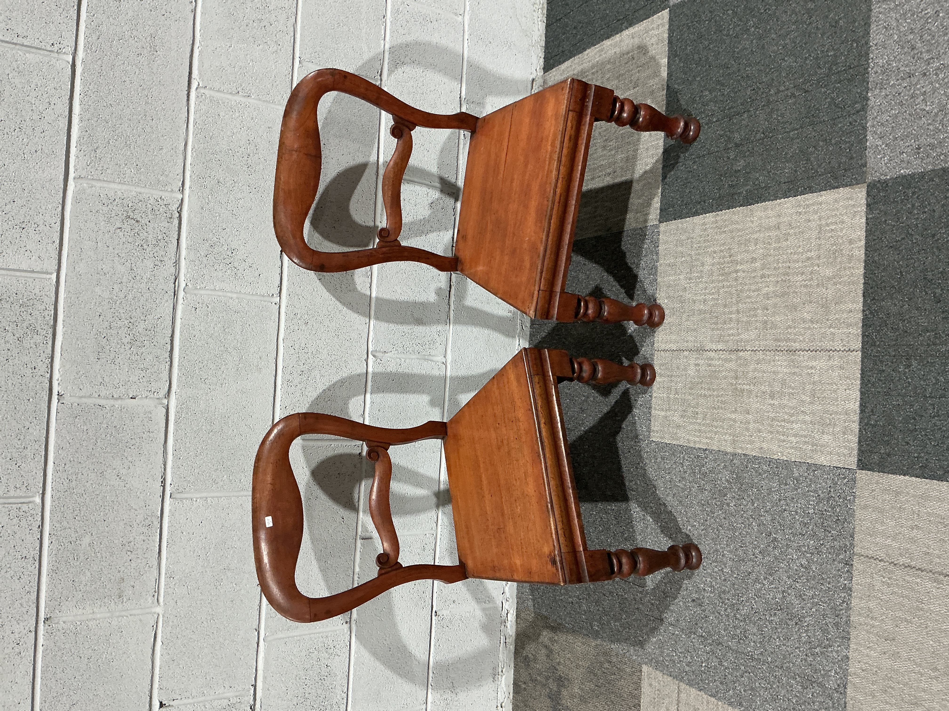 A matched pair of mid-Victorian mahogany hall chairs. Each chair features a characteristic balloon-shaped open back with a central scrolled horizontal splat. The chairs are designed with solid timber panel seats featuring moulded edges. The frames are supported on turned and ringed front legs and square-section, slightly out-swept rear legs. No maker’s marks are visible on the frames. A small white adhesive label is present on the back rail of one chair.