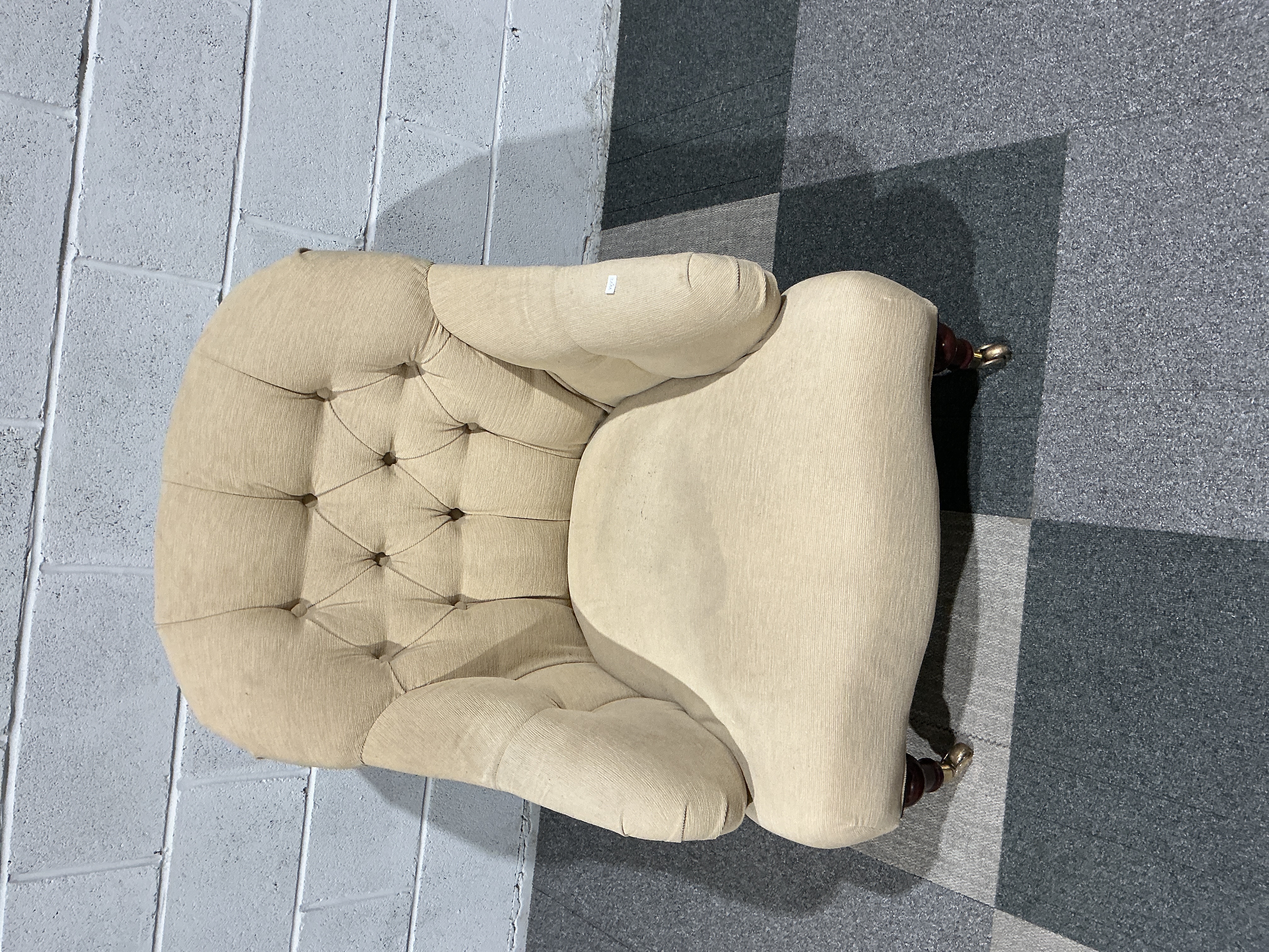 Victorian Low Upholstered Armchair with Deep Buttoned Back and Brass Casters