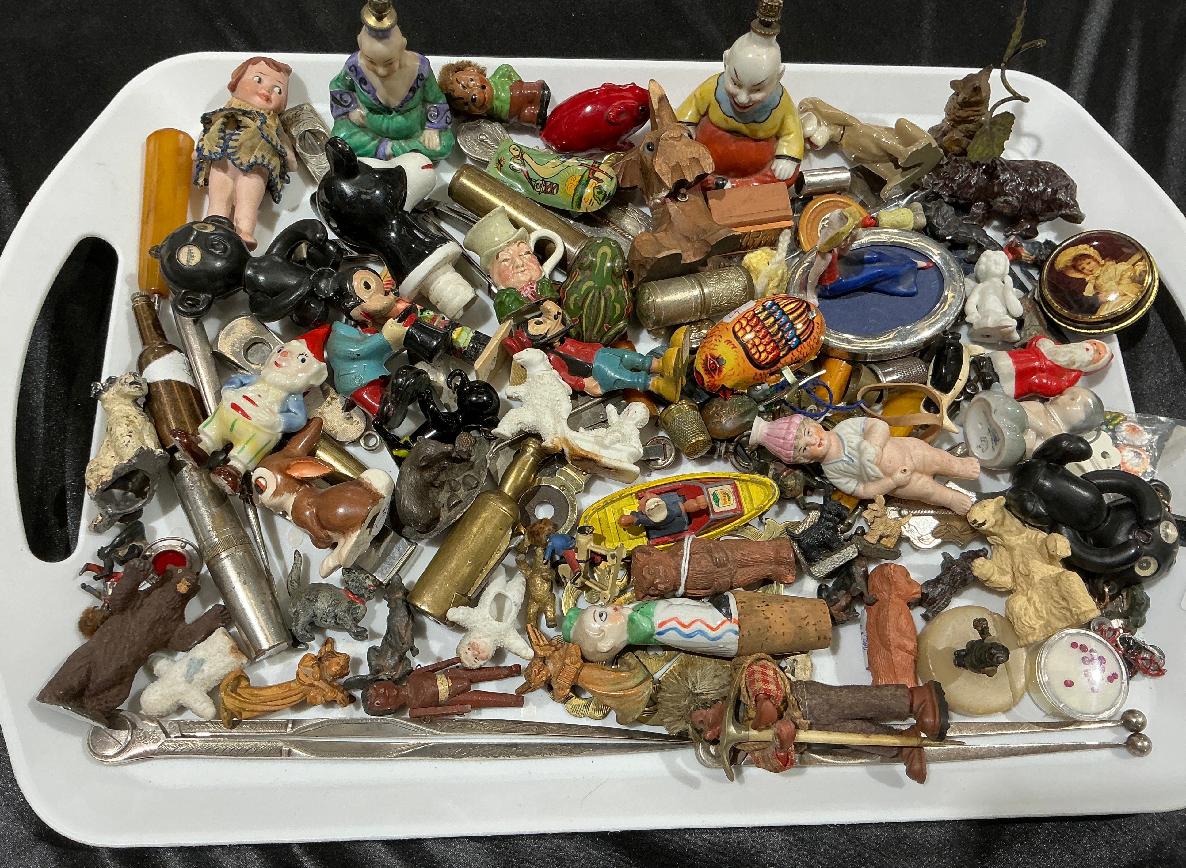 An assortment of vintage and antique miniature figurines, curiosities, and small utility objects. The collection features a variety of materials including porcelain, hand-painted lead, carved wood, brass, and composite materials. Human and humanoid figures include jointed bisque dolls, painted gnomes, and a character resembling Mickey Mouse. Animal representations include a brown bear, several deer, a frog, and a bird with patterned decoration. Utility and decorative objects include a pair of long silver-toned metal tongs with chased detailing, a metal whistle, various brass cylindrical components, and a small circular metal box with a printed lid featuring a female portrait. The lot also contains items designed as bottle stoppers and small brushes with natural bristles. Several pieces incorporate components such as cork and metal fittings.